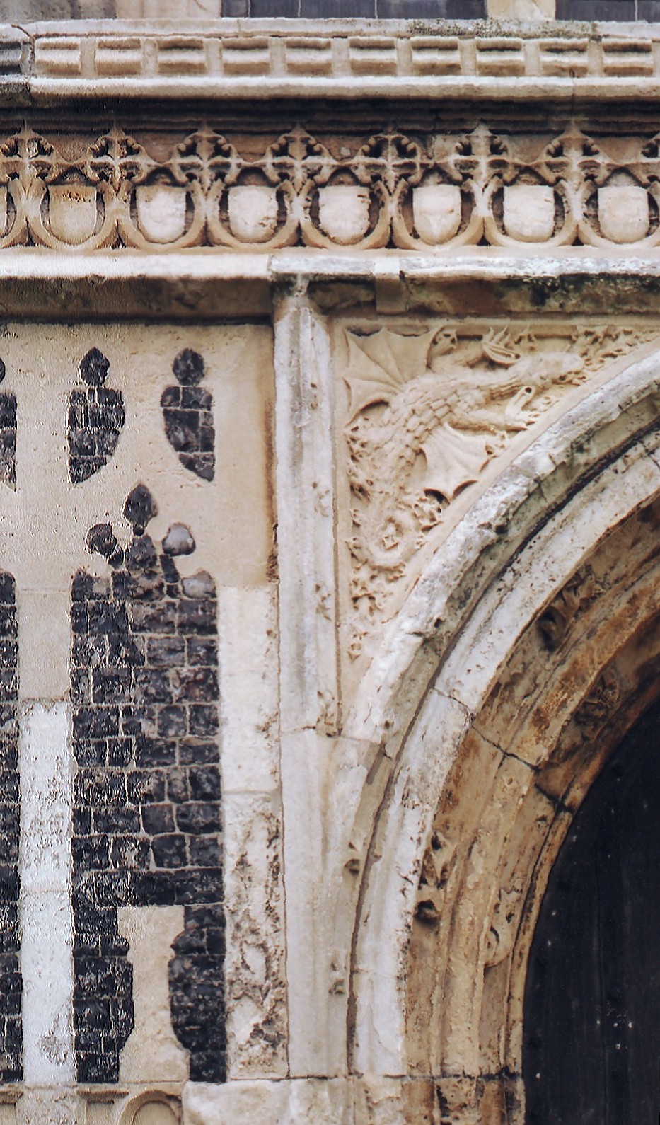 Save only in the tower, the windows to the church are all four-centred and supermullioned. The aisle windows are four-light with two tiers of reticulation units which occupy a third of the window depth, the clerestory windows are two-light, the chancel windows beyond the chapels are three-light with stepped supertransoms, and the E. and W. windows (to the chancel and tower respectively) are four-light with subarcuation of the outer lights in pairs, supertransoms, and to the east, a wheel of quatrefoils in the head. All lights are ogee-arched, and the sublights of all windows except those of the clerestory, are cinquefoil-cusped like the main lights. The latter is nearly always a sign of work of high quality, which is clearly the case here. The N. doorway carries two casement mouldings rising between bowtells, decorated by carved fleurons at intervals. The W. doorway presents a more elaborate version of this design and is set in a square surround with finely carved dragons in the spandrels (shown below left). The porch outer doorway has three orders of shafts with traceried spandrels and over the lower storey there is a tierceron vault.