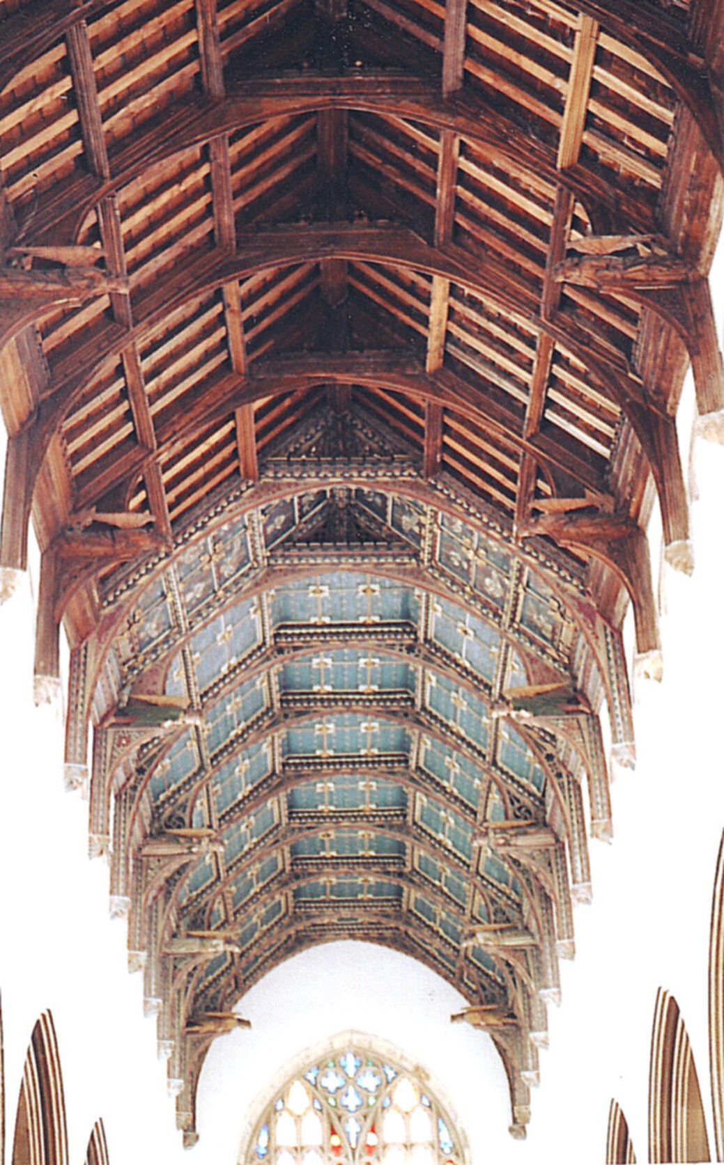 The church carpentry is rich though much of it is renewed. This includes the nave and chancel roof (shown above right, viewed from the west), of alternate arched brace and hammerbeam construction, with hammerbeams decorated with angels, now largely of 1867. The section over the chancel has been attractively painted, as also has the pulpit (in 1928), albeit not in a manner showing much sensitivity to the original work. The font cover, said to be the tallest in England, was made by F.E. Howard in 1935. That leaves chiefly the screens of c. 1480 that stretch across both chapels and the chancel, and were judged by Pevsner to be by three different hands. The painted, panelled dados feature the 'nine orders of angels' in the section facing the N. aisle, the apostles in the central section facing the nave, and a selection of Old Testament prophets in the section facing the S. aisle. Backing against the central section are a number of misericords, but the arm rests on some of the other stalls are of more interest and include a lion and a figure obviously suffering from toothache. Finally, the oak door to the church from the porch is original, as are the priest's door from the chancel (to the south) and that to the vestry (to the north).