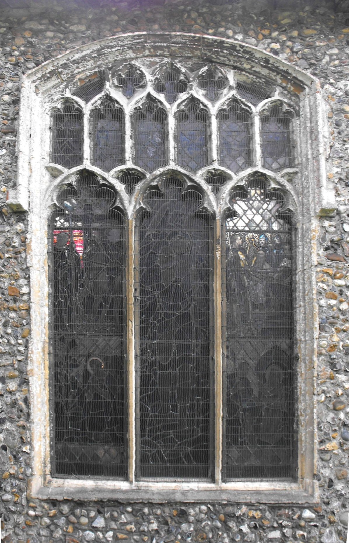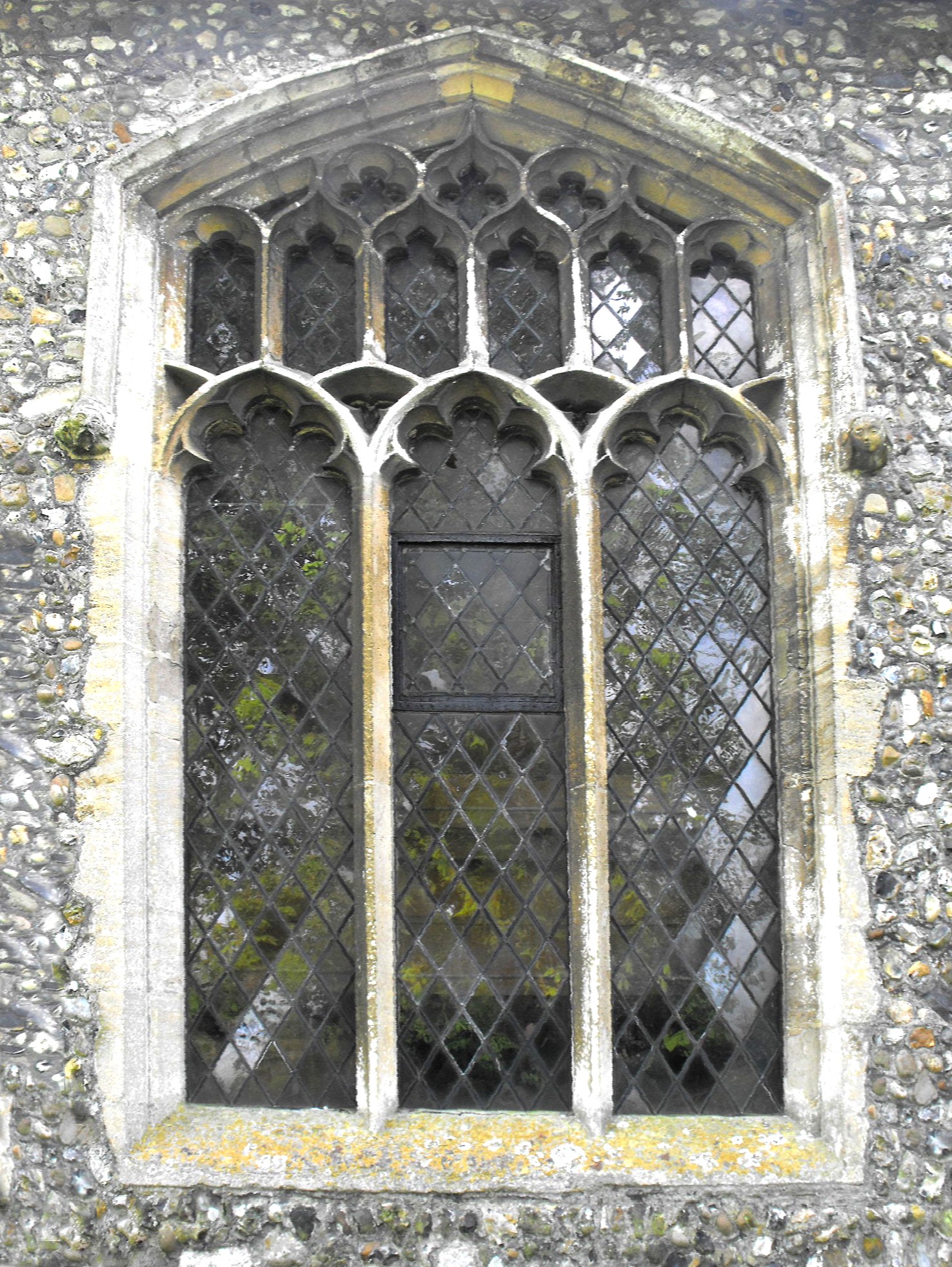This is a relatively modest and substantially renewed building, yet there is much to ponder here and a fascinating study could be made of this church alone. Beginning from the west, the unbuttressed tower is Early English work of the late thirteenth century, which rises in three stages to 'Y'-traceried bell-openings and (probably later) battlements, lit below by a restored three-light W. window with intersecting tracery. Windows in the rest of the building, aside from the wholly Victorian clerestory, have been renewed to the south and restored to the north while almost certainly retaining their mediaeval forms, as witnessed by the remaining mediaeval stonework to the north and the general 'hotchpotchedness' of the combination of designs. There are two principal forms: (i), a two-light window comprising Y-tracery with trefoil-cusped lights with trilobes above the lights and a dagger in the window apex (although one to the north differs significantly from the others); and (ii), a three-light Perpendicular form with little linking subarcuations above the lights, which appear to represent an extension of the two-light design encountered at Stowlangtoft and elsewhere. The late Birkin Haward listed this church as one that may have been erected in a single campaign (Suffolk Medieval Church Arcades, p. 340), to which he applied a date of c. 1280. Yet the tower and (as the church interior reveals) tower and chancel arches, could easily be earlier, while the two-light aisle windows and, still less, the arcades, seem unlikely to predate the turn of the next century. This may suggest that an originally aisleless nave was reconstructed with aisles, some thirty or forty years later. As for the inserted three-light Perpendicular windows (three renewed ones to the south and two partly old ones to the north), these can probably be dated by association with their two-light counterparts at Stowlangtoft, which are known to have been constructed c. 1390. These windows appear more widely in a loose cluster around the present-day local authority of Mid Suffolk and seem almost certainly the work of the same hand, although attributing anything else to this mason with certainty, other than windows, except at Stowlangtoft, proves a real challenge. These windows show one variation here, also seen at Rattlesden, in that two are segmentally arched (in the nave aisles, as illustrated by the N. aisle window, below left) instead of segmental-pointed, which is more usual. (See the photograph of the re-set window in the organ chamber, below right.) To describe these windows with complete precision, to try to ensure they are indeed the work of the same man: (i) the principal lights are two-centred and trefoil-cusped; (ii) there are four straight-sided subreticulation units above in the case of a two-light window and six in the case of a three-light window, of which the outer pair are two-centred and the inner units, ogee-pointed; (iii) two-light and three-light windows have, respectively, either one or three quatrefoils in the heads of the arches, where the central quatrefoil is ogee-pointed at the top and the bottom and, in three-light windows, the outer pair of quatrefoils are ogee-pointed at the bottom but two-centred at the top.