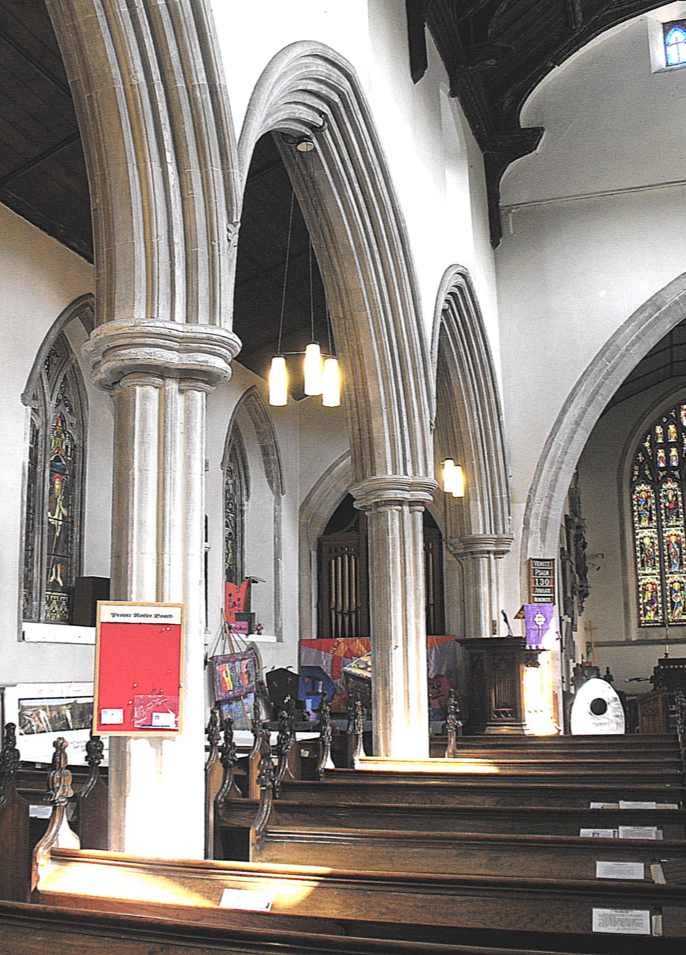 The church interior at Sproughton is dominated by the three-bay nave arcades (see the interior view of the church, below, and the larger photograph of the N. arcade, below left), described by Birkin Haward as 'of outstanding merit and the only examples of their kind in Suffolk'. 'The piers are deeply moulded with four filleted shafts and four keeled shafts in the diagonals... [separated by continuous hollows, and these support] deeply moulded capitals and arches' (Nikolaus Pevsner and James Bettley, The Buildings of England: Suffolk West, New Haven & London, Yale University Press, 2015, p. 485). By contrast, the tower and chancel arches (which the British Listed Buildings web-site declares to have been reconstructed, although if they are, it must surely have been in the original form) are each composed, very simply, of two flat-chamfered orders.