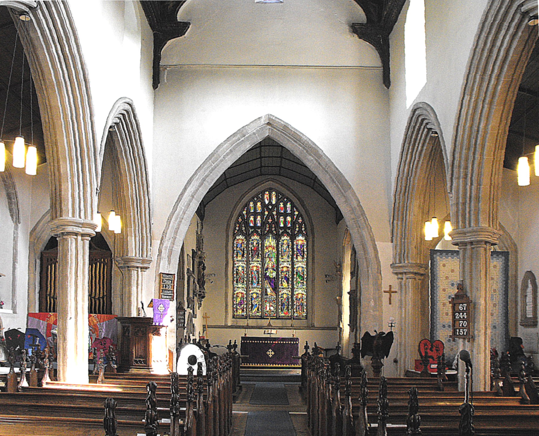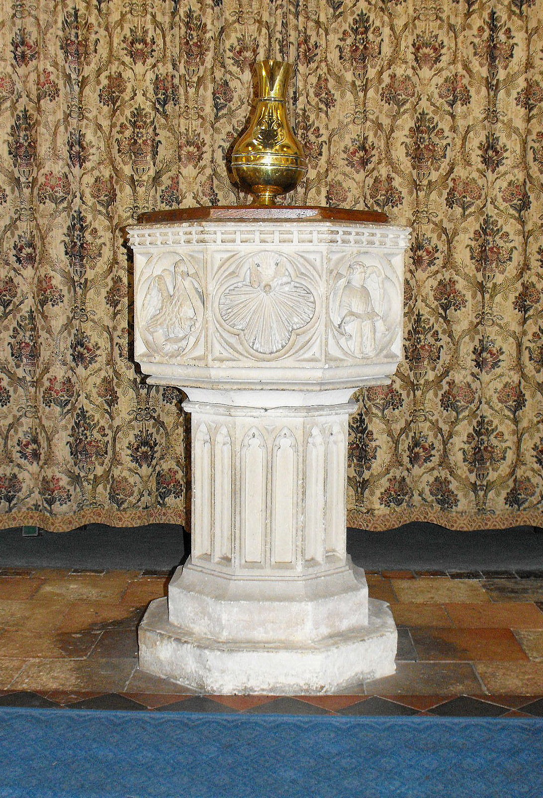 Finally, although furnishings in the church are of less interest than the architecture, a few items are worth notice. The font (illustrated below right) is Perpendicular but has probably been retooled: the octagonal bowl is decorated by symbols of the Passion on the cardinal faces and of the Evangelists between, and stands on an octagonal stem with two blank cinquefoil-cusped arches on every side. Monuments include a large theatrical sixteenth century one on the N. wall of the sanctuary, commemorating Elizabeth Bull (d. 1634) and featuring the deceased in effigy (although probably, at that date, not intended to represent an actual likeness) kneeling in prayer before a prayer desk, while a pair of angels at the sides hold back a pair of curtains. A much simpler memorial engraved in slate on the chancel S. wall, dedicated to a former rector, Joseph Waite (d. 1670), has the Chi Rho symbol at the top, an hour-glass standing on a skull in the centre, and a selective misquotation from Job, ch. 14, v. 14, below, which makes use of the fact that capital 'J's were once written as 'I's: '...all the days of my appointed time will I waite, till my change come'.
