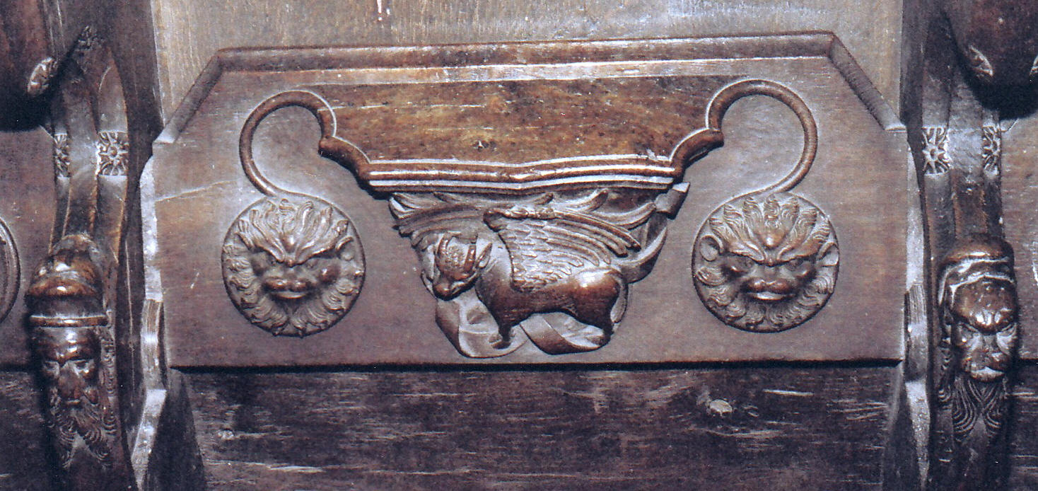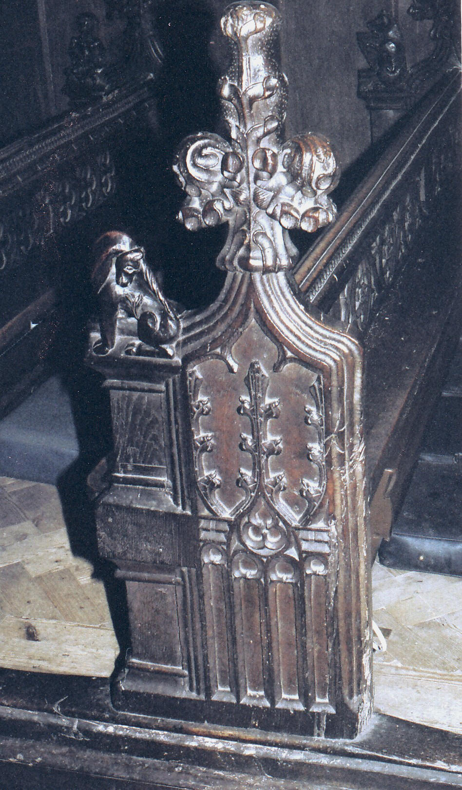 Surprisingly, inside the church quite different matters come to the fore, for the architectural interest is less and one suspects the tower and chancel arches may have been restored, presumably by William White (1825 - 1900), great nephew of Gilbert White of Selborne. William White was here in 1855 and it is he who has to accept responsibility for the stone pulpit. This is hardly noticeable, however, for all attention is taken by the woodwork, especially the nave benches, of which eleven are original on the south side and twelve on the north, all with carved backs, traceried bench-ends and carved arm rests, featuring such subjects as a fox with a goose in its mouth, a chained monkey, a unicorn (shown below left), a boar playing a harp, and a mermaid with a mirror. They are indisputably by the same firm responsible for the fine benches at other nearby churches, including Norton, Tostock and Woolpit, and would make an interesting subject for close study, to see whether the work of individual craftsmen could be distinguished, for it surely required a considerable number to make all of these. Even on a superficial examination, however, many close similarities are apparent, not only in such basic matters as the overall shape of the bench ends or recurring subjects on the arm rests (note, for example, the preponderance of dogs), but also in their more subtle, less easily definable characteristics, relating to such things as the attitudes of the creatures and their facial expressions. Yet even when one has tired of looking at these, the exhibition of mediaeval carpentry in the church is not exhausted for there is also the set of outstanding stalls in the chancel (see the bench end illustrated below right), both to north and south and backing on to the dado of the former rood screen to the west where there are three misericords on each side. The subjects of these are a dragon with a long tongue, the angel of St. Matthew, the eagle of St. John, the lion of St. Mark, the ox of St. Luke (shown at the foot of the page) and a hawk swooping on a hare. The N. and S. stalls have carved figures in place of the usual poppyheads. The dado of the rood screen is composed of three double panels on each side, divided by buttresses with crocketed canopies.
