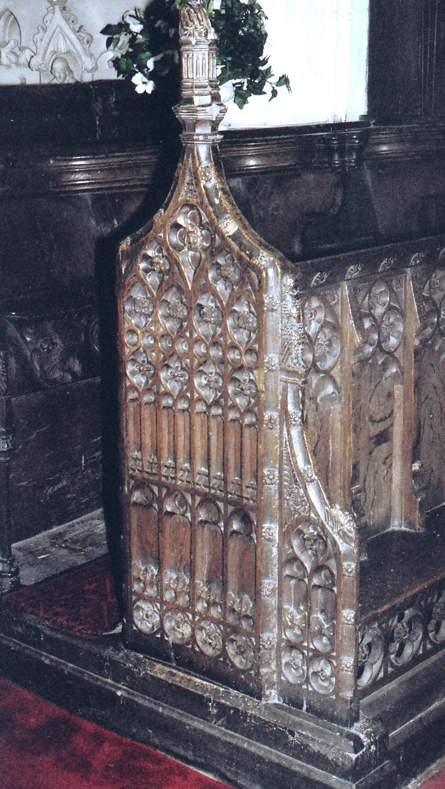 Finally it remains to describe two monuments, one in the tower and the other high up on the chancel S. wall. The former commemorates Sir Willoughby d'Ewes (d. 1685) and has an open pediment supported on barley-sugar columns. The latter features three effigies beneath a coffered alabaster arch topped by an open pediment, featuring Paul d'Ewes (facing north) and his two wives (kneeling and facing inwards on either side), beneath which d'Ewes's son and seven daughters are depicted, two carrying skulls to indicate they had predeceased their father. Unusually the contract for this work survives, showing it was carved in 1624 by Jan Janson of St. Martin-in-the-Fields for sixteen pounds and ten shillings.