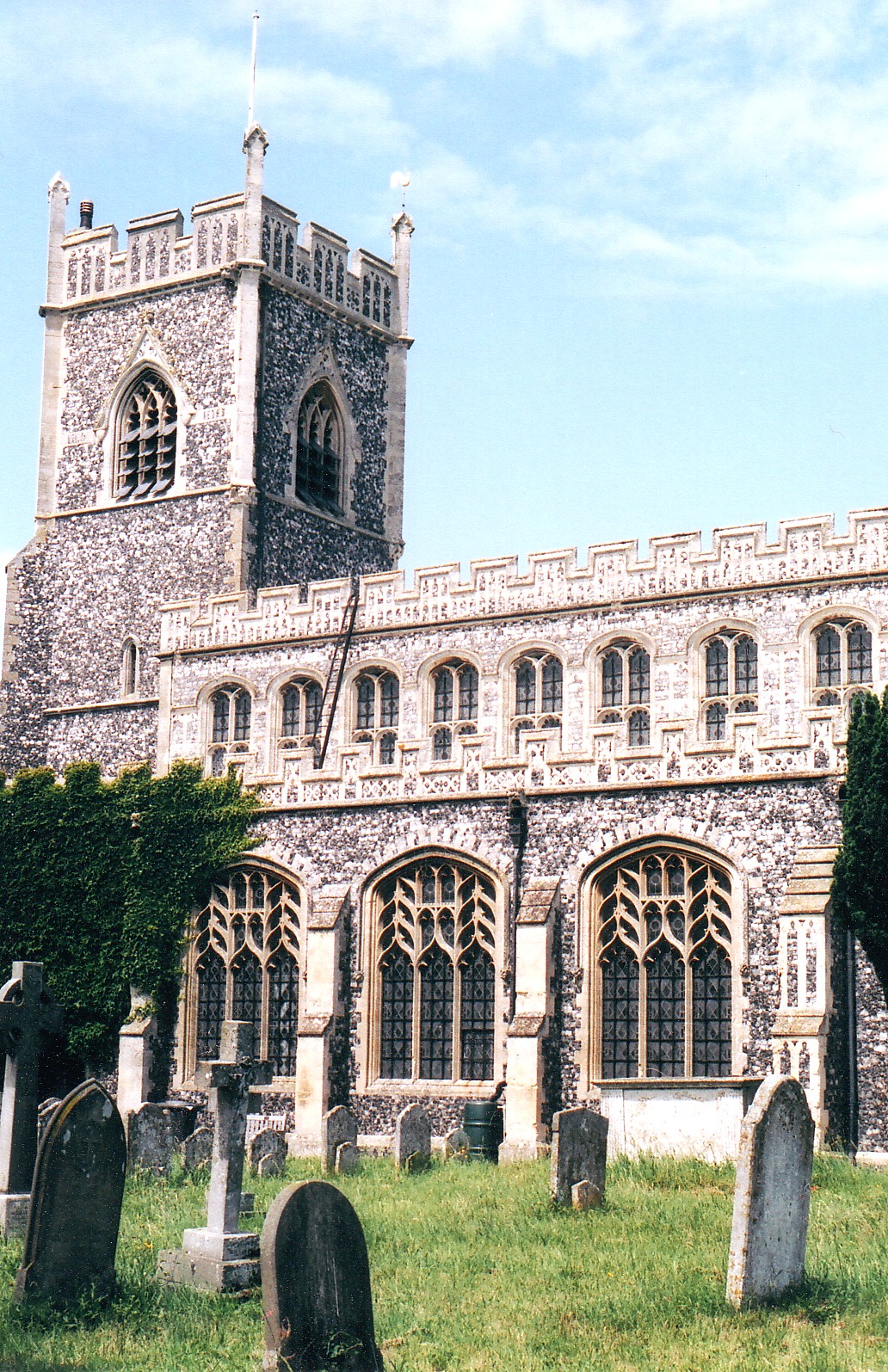 [Related buildings the reader may wish to examine on this web-site include Burwell and Isleham in Cambridgeshire, Colchester SS. James & Paul, Dedham, Saffron Walden and Thaxted in Essex, and Cavendish, Denston, Hessett, Lavenham and Long Melford in Suffolk.]