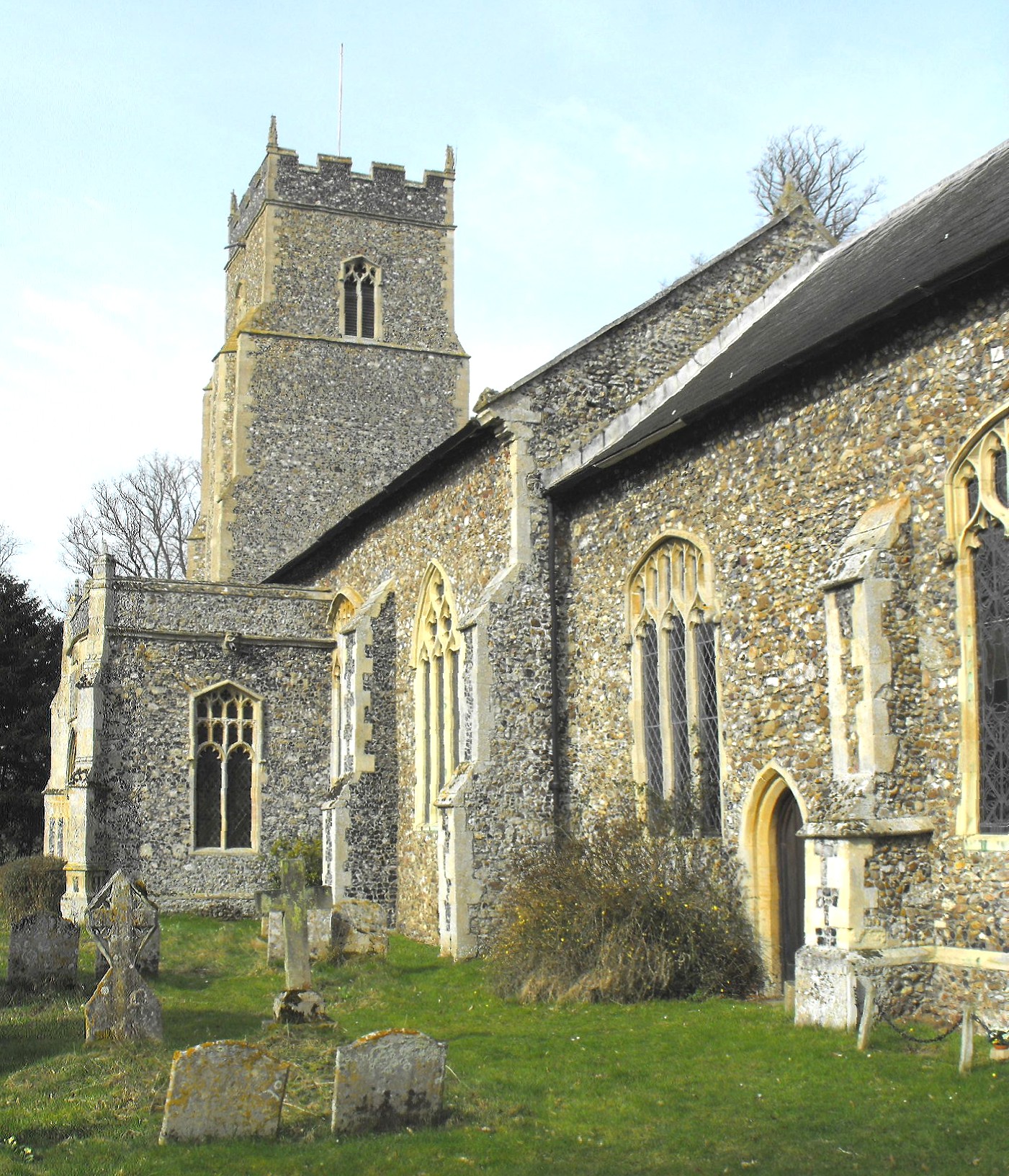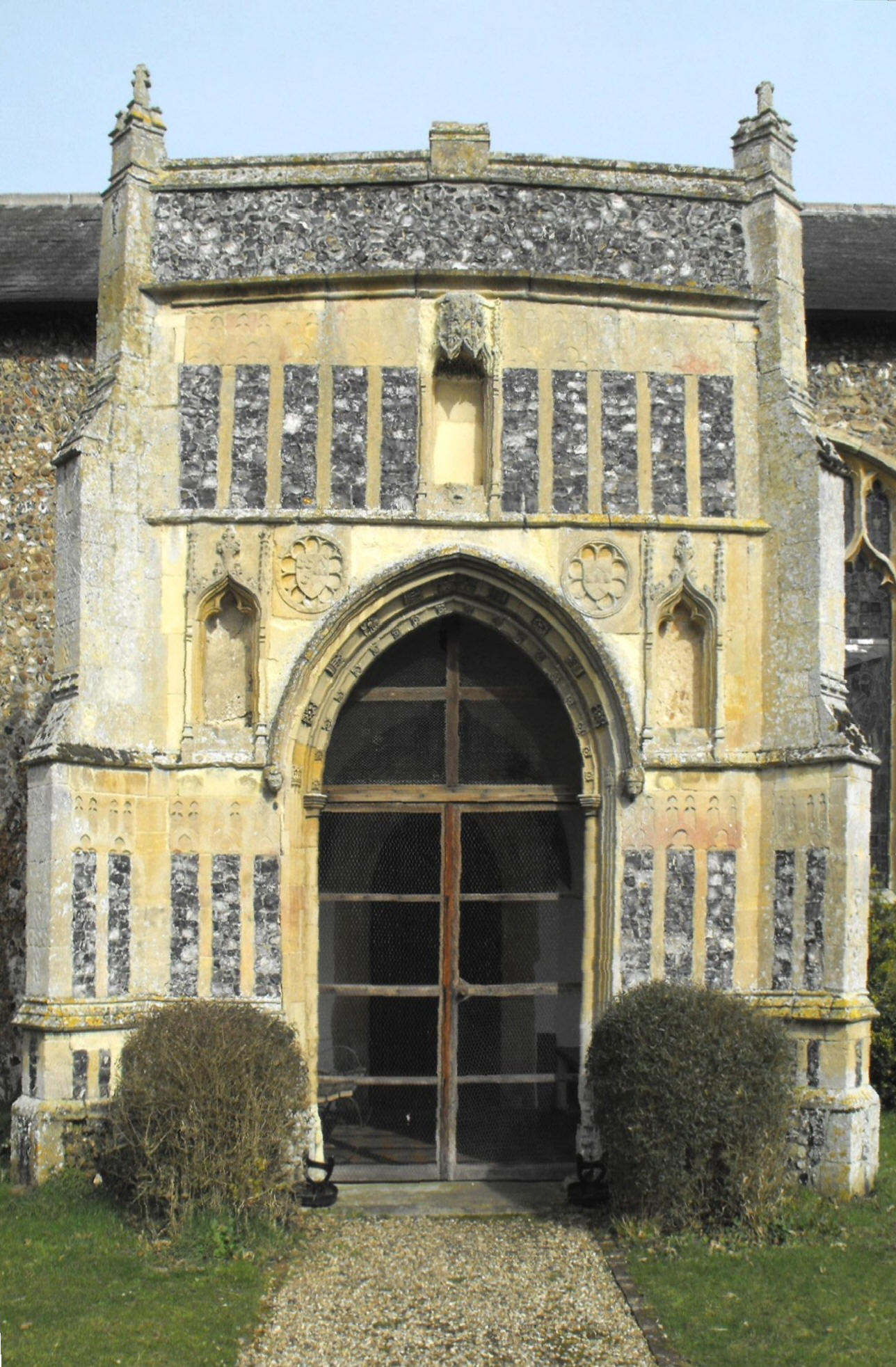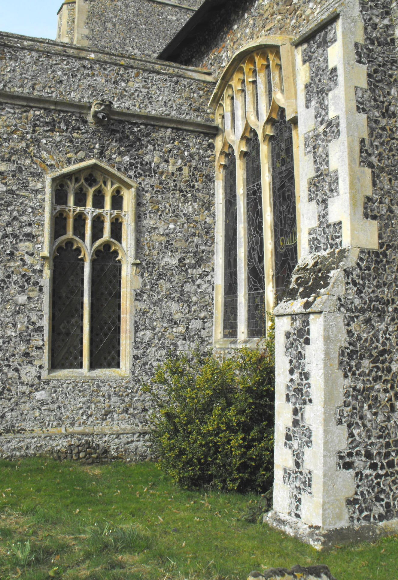 Comprising a W. tower, a nave with S. porch and N. vestry, and a chancel, this is pleasantly situated church (seen above left from the southeast) constructed of flint and pebble rubble with limestone dressings and slate roofs. The tower and chancel are Decorated* in their earliest surviving details while the nave and porch now appear entirely Perpendicular, albeit of two distinct building phases, as shown by the inept way in which the porch cuts into the S. window to the west (as illustrated above right)