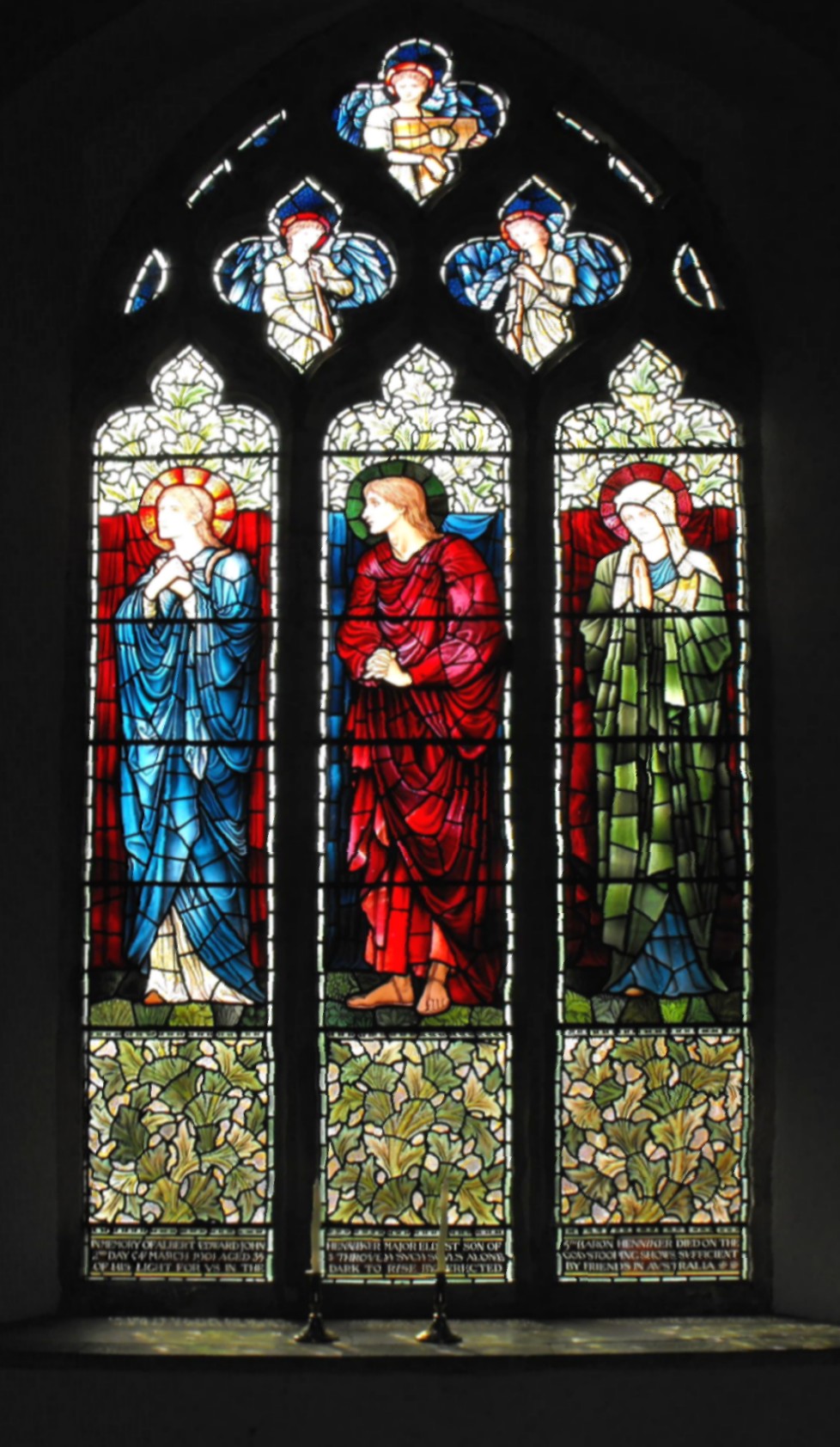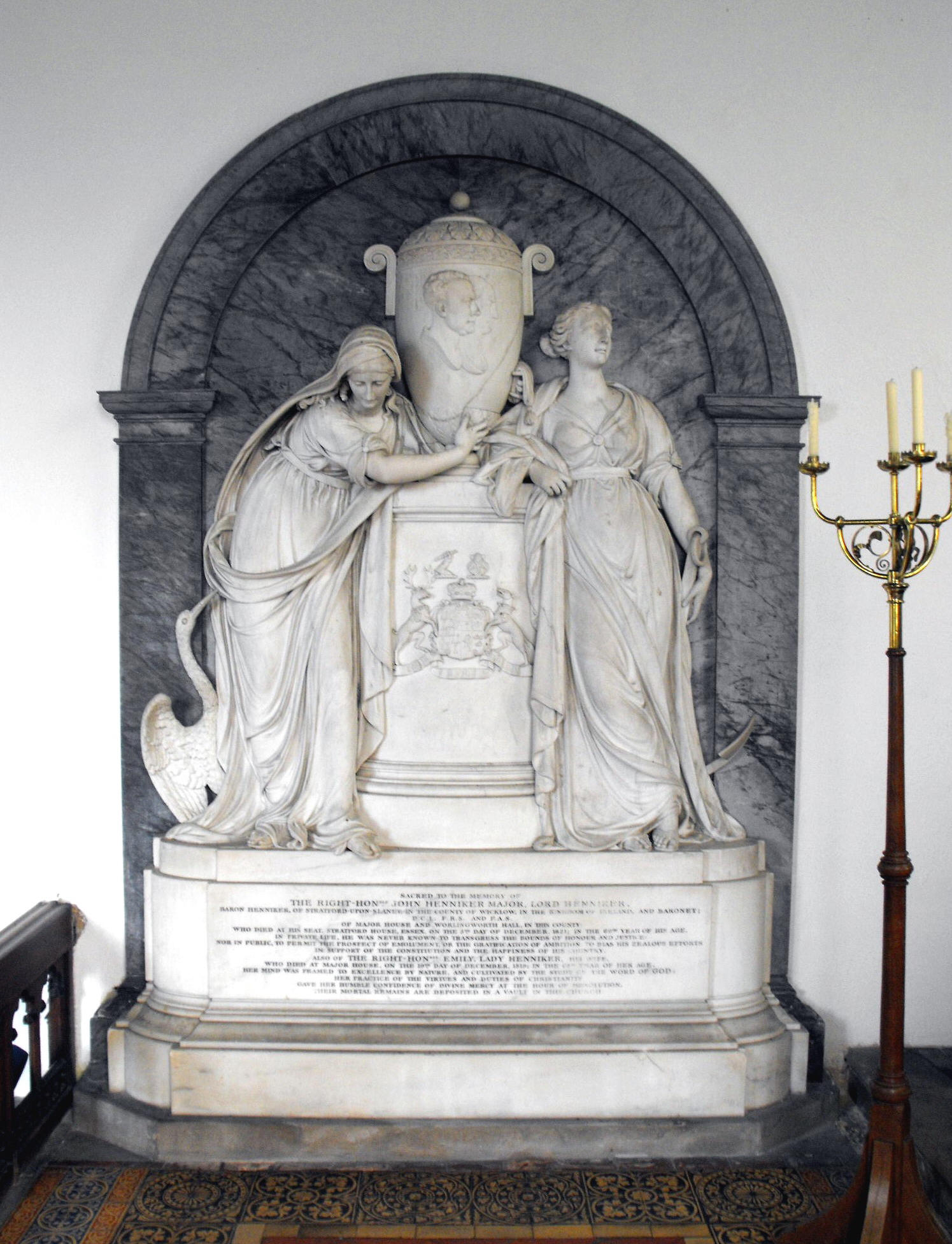 Woodwork in the church now appears almost wholly Victorian, although the nave roof, of single hammerbeam construction, was probably mediaeval before it was restored within an inch of its life. Also Victorian is the attractive tiled floor to the sanctuary, besides the stained glass in the windows, of which that in the westernmost S. window (shown below left) was designed by Edward Burne-Jones (1833-98). This displays three figures, depicting - from right to left - St. Mary (in unaccustomed green), St. John and St. Mary Magdalene. However, the most striking internal feature of the church is probably the large monument against the chancel N. wall (shown below right), by Josephus Kendrick (1791-1832), whom Gunnis described as 'a competent minor sculptor, whose smaller monuments and bas-reliefs are harmless and even pleasing [but who] when... chosen as the sculptor for the national monument to Sir William Myers, 1816, in St. Paul's Cathedral, ...attempted... a task far beyond his powers and produced one of the most unfortunate memorials in the whole building. The design - one of complete bathos - shows Hercules and Minerva warmly shaking hands in front of a tomb surmounted by a bust of Myers' (Dictionary of British Sculptors: 1660-1851, London The Abbey Library, 1951, p. 226). Fortunately, Kendrick's monument here - to Lord Henniker (d. 1821) and his wife, Emily (d. 1819) - while substantial, is altogether more conventional, and although, arguably, the two allegorical female figures leaning on a pedestal on which stands an urn bearing profiles of the deceased, are not entirely well balanced (with one figure upright and one stooped), nevertheless they are generally well-carved and their draperies handled very effectively, and it would be churlish not to accept this as a good piece of work overall, showing Kendrick to be a more capable artist than his rather embarrassing efforts at St. Paul's might suggest.