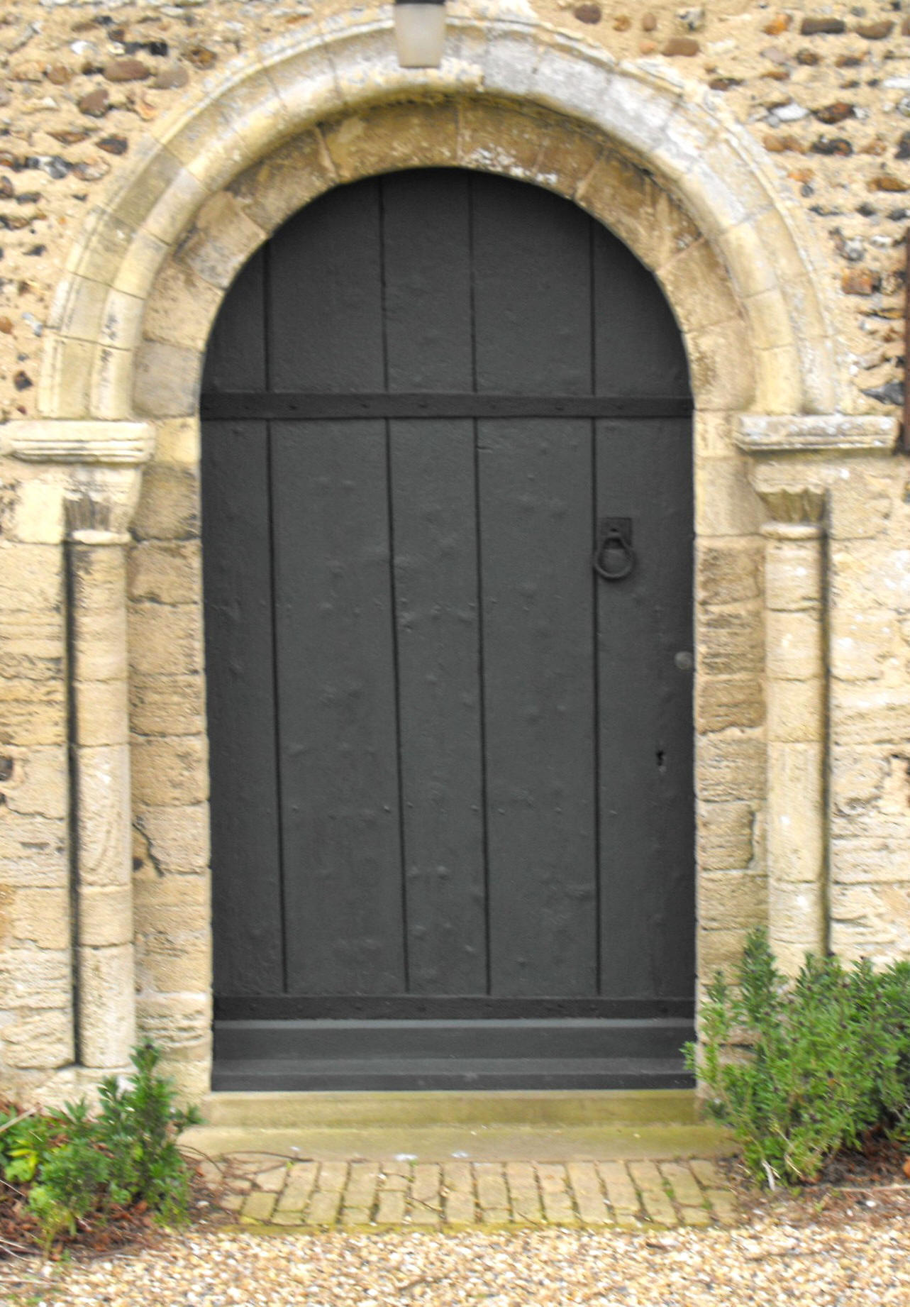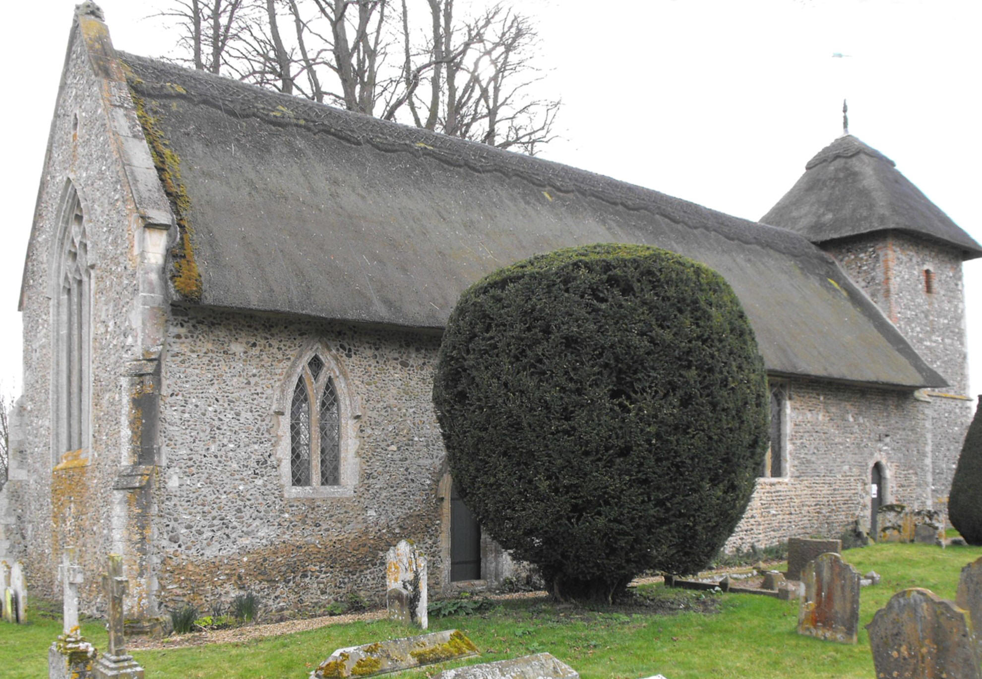 This is a small building of considerable interest, albeit that, perhaps, some of its features are not quite as special as the church literature suggests. Constructed of coursed rubble with lashings of mortar between, the church (shown above from the northeast) consists of a short W. tower, and a nave and chancel forming a single unit, and its striking appearance on approach is due to the fact that not only are the nave and chancel thatched, but so also is the tower, which has a pyramidal roof. The oldest features include the Norman N. and S. doorways to the nave, of which the former is plain and the latter (shown below left) carries a roll supported on abaci atop an order of shafts with scalloped capitals that differ slightly left to right. There is also a little Norman window in the nave S. wall while other windows comprise: (i) two with Y-tracery, opposite each other in the chancel, commensurate in style with the late thirteenth century; (ii) a three-light window in the chancel E. wall (shown below right), in early fourteenth century reticulated form, which could be contemporary with the two-light window with flowing tracery, now renewed in the head, in the nave S. wall towards the east; and (iii) three, two-light square-headed Perpendicular windows with cinquefoil-cusped lights, one each in the nave N. wall and the S. walls of the nave and chancel. The tower, which rises in two stages to the simplest of one-light bell-openings, lit below to the west by a window with depressed cinquefoil-cusped Y-tracery, is of interest not for these details but because a contract for its erection survives with one, Richard Cuttyng, and his partner, John Tilley, who appear to have undertaken the work c. 1485-6 and of whom nothing else is known. It seems evident, however, that the pair were not distinguished masons, for modest though their commission was, an action was taken against them afterwards on the grounds of defective workmanship - then a rare event indeed (John Harvey, English Mediaeval Architects: a Biographical Dictionary, London, Alan Sutton, 1987, p. 300).