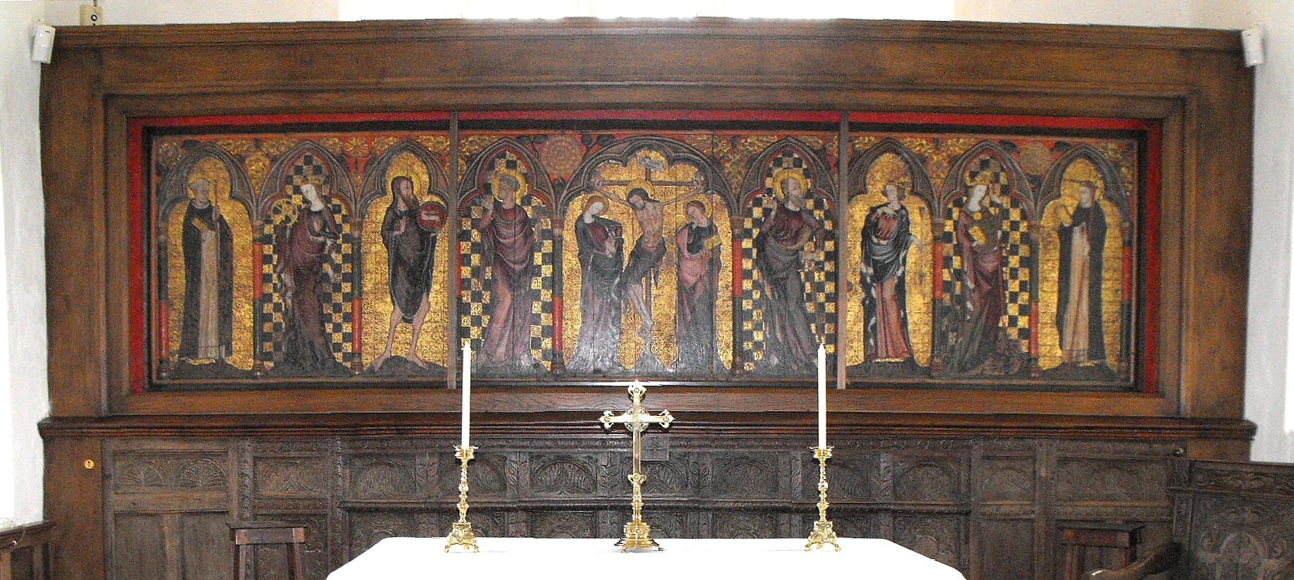 However, of greater significance than these is the painted oak retable in the chancel (illustrated below), of unknown origin but discovered in a barn at Thornham Hall in 1927 and dated on stylistic grounds to c. 1330. This is altogether finer stuff which 'it has been convincingly argued... was [originally] an altarpiece for the Dominican priory (Blackfriars) at Thetford, Norfolk, founded in 1335' (ibid., p. 535). Inevitably, the figures have darkened over the centuries, but its state of preservation appears good otherwise, even allowing for the wholesale restoration carried out around the turn of the present century. Pevsner's description of the painting style deserves to be quoted in full for it certainly cannot be bettered: "The figures are slim and swaying. The drapery folds have deep troughs across the waist and then fall diagonally. The background is treated in fine patterns... The spandrels have various flowers and leaves in relief, also painted and gilded'. The figures represent, from right to left, St. Dominic, St. Catherine, St. John the Baptist and St. Peter, followed by a Crucifixion scene with SS. Mary and John the Evangelist looking up at Christ on the Cross, after which there come St Paul, St. Edmund, St. Margaret of Antioch and St. Peter Martyr.