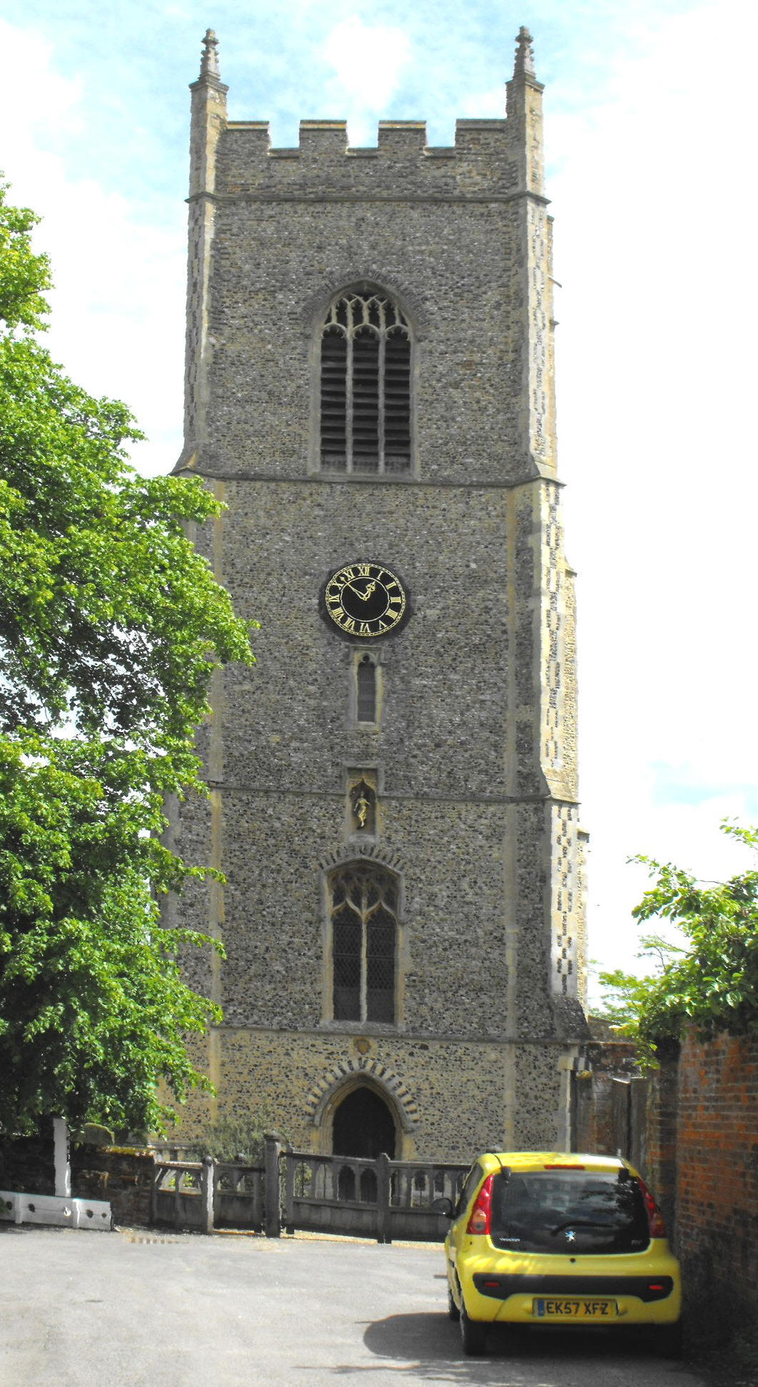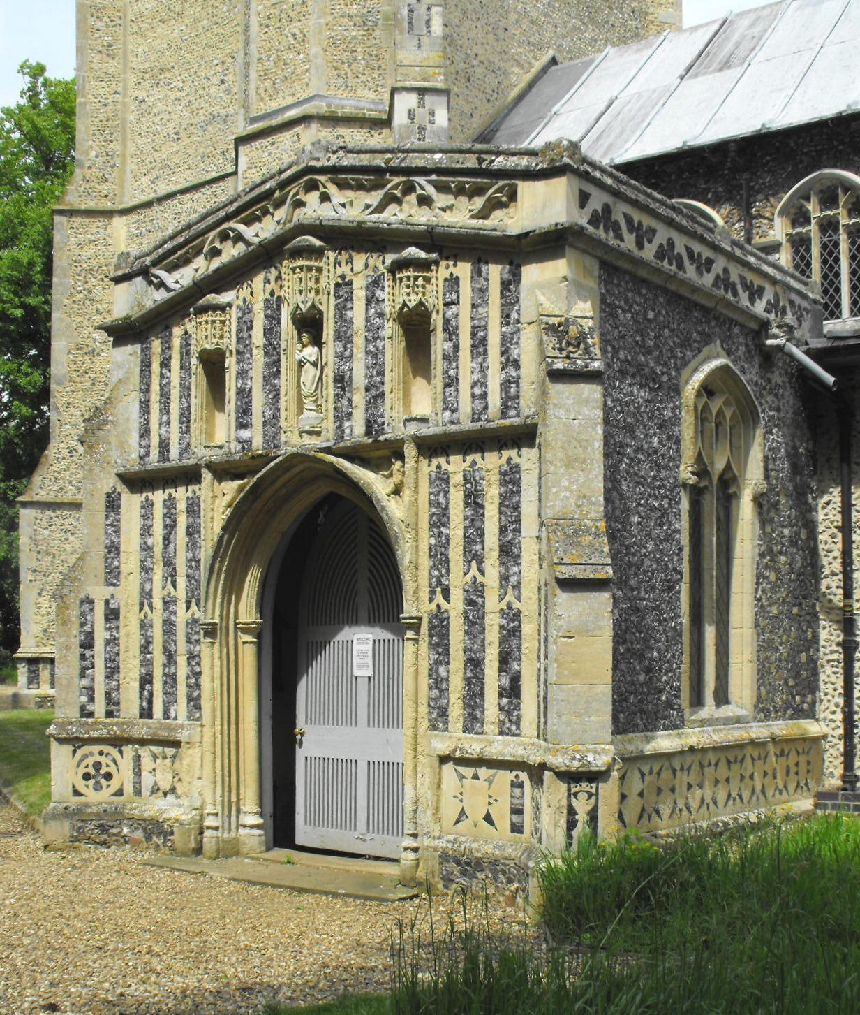 However the best work is the proud fifteenth century porch (illustrated above right), decorated with flint flushwork on the S. front featuring two stepped tiers of arches each side of the doorway and a third tier above, interrupted by three elaborate canopied niches. The parapet displays a cusped wave moulding, formed in flushwork to the east and west, and carved on stone to the south. The outer doorway bears a complex series of narrow mouldings around a two-centred arch, supported on jambs with two orders of shafts, and is set beneath spandrels depicting St. George (on the right) and the dragon (on the left). The probably contemporary nave clerestory is formed of eight three-light windows on both the aisleless N. side and the S. front above the aisle, with strong mullions and castellated stepped supertransoms beneath segmental-pointed arches - a grand conceit for a relatively small church in such a rural position. The two aisle windows in the S. wall east of the porch, and the three renewed windows in the chancel (two to the south and one to the north), are similar, suggesting they were inserted when the clerestory was added. The diagonally-buttressed tower (shown from the west, above left), also approximately of the same time, rises in four stages to bell-openings that are three-light in the direction of the approach road from the west but only two-light elsewhere. A semi-polygonal projection housing the stair turret, rises to the bell-stage to the southeast.
