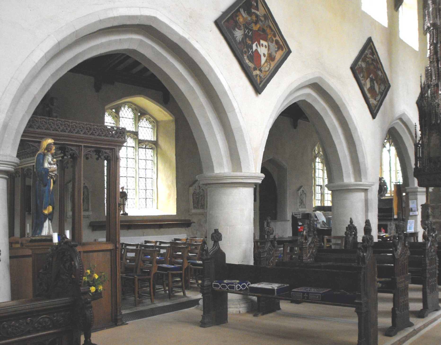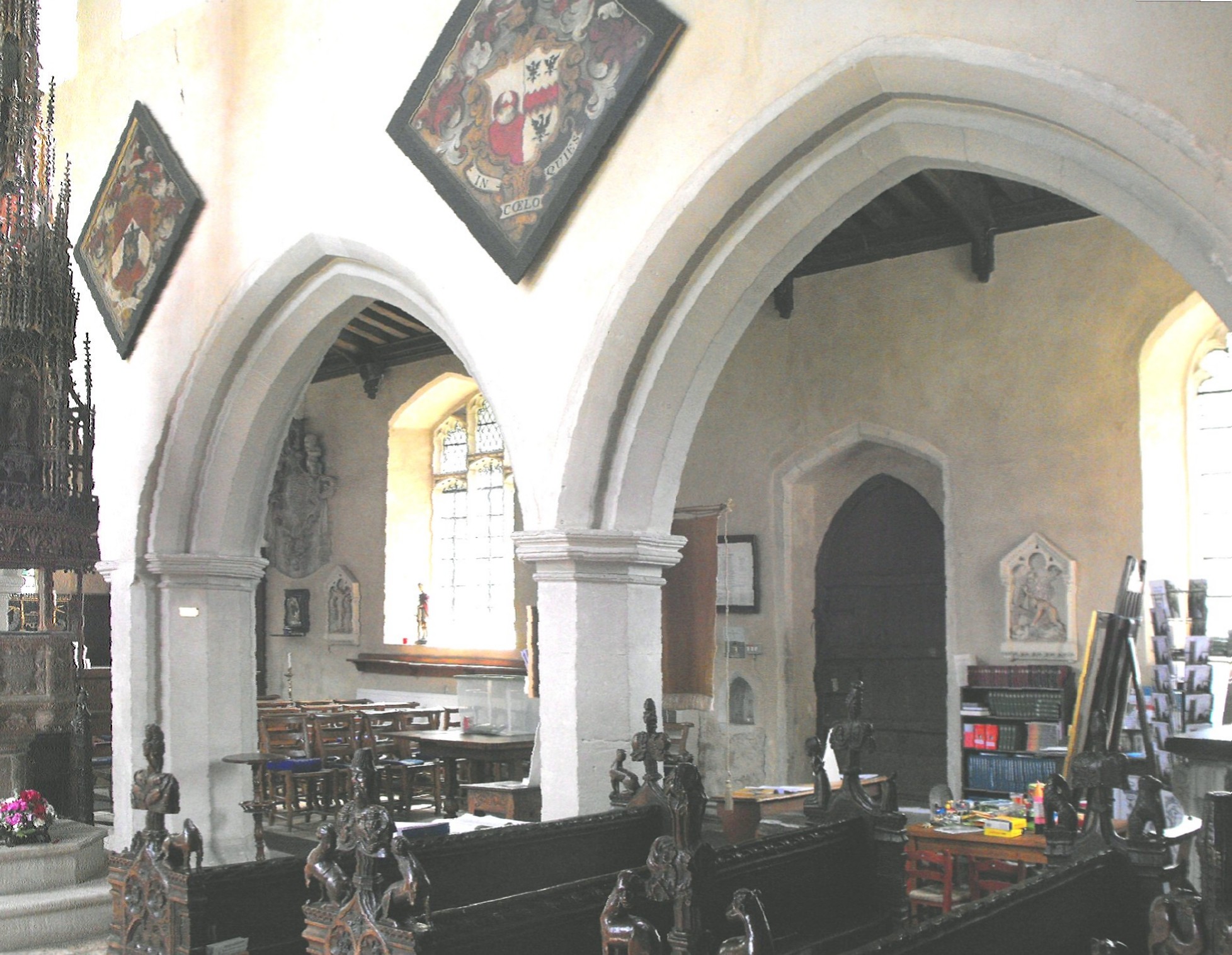 The huge monument in the W. end of the aisle, curiously displaying two large cows (presumably intended to be oxen) above the tomb chest, with garlands around them, commemorates Sir Henry Wood (d. 1671), treasurer to Queen Henrietta Maria during her exile in France following the execution of her husband, King Charles I, in 1649.