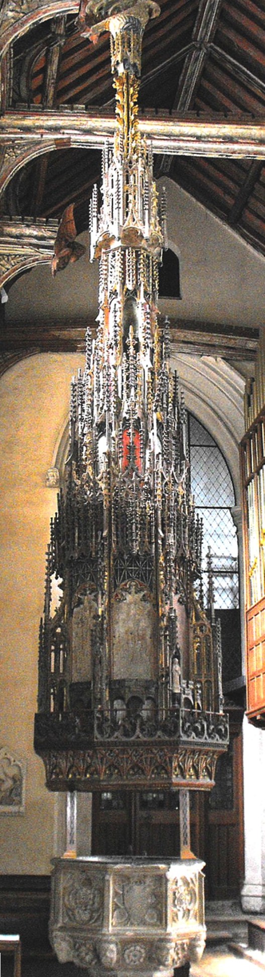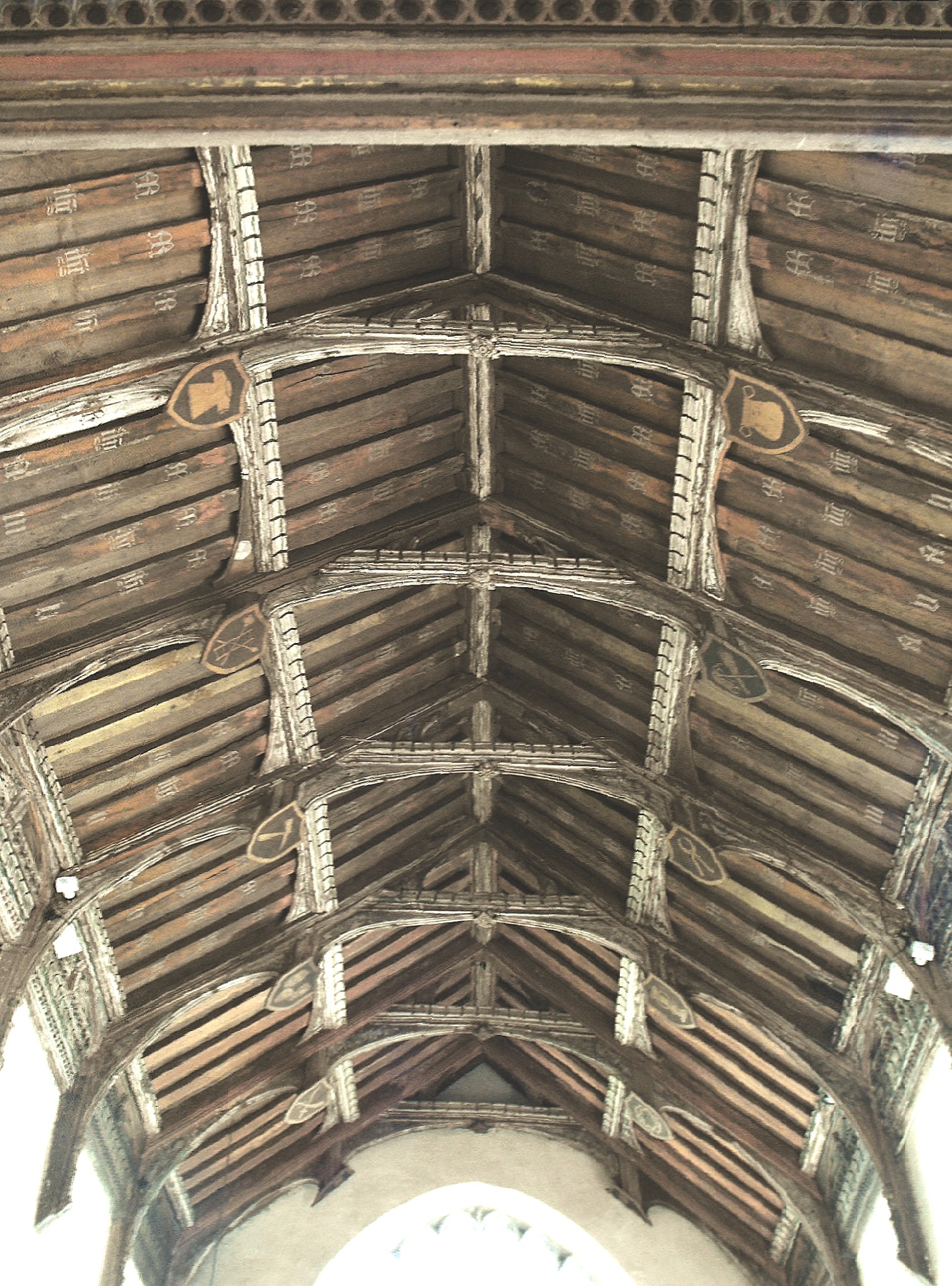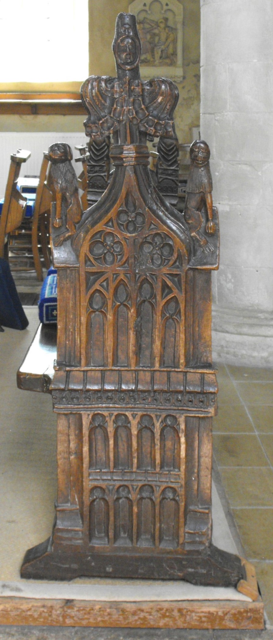 The very attractive chancel roof (illustrated above) is composed of six bays: the cornice is elaborately carved with little tiers of pierced quatrefoils, crenulations and fleurons beneath a line of carved angels, touching wing to wing along both sides, and there are castellated purlins halfway up the roof pitch, together with pendant posts and castellated collars tenoned into the junctions between these and the principal rafters. The nave roof alternates tie beams with false hammerbeams, now bearing huge wooden angels which the church guide says were carved at Oberammergau c. 1890 (Roy Tricker and W.G. Arnott, St. Mary of the Assumption at Ufford in Suffolk, 2004, p. 8). Here there are purlins at the one-fifth and three-fifths positions, but as there are no collars, it has a disconcertingly unstable appearance nonetheless. However, the truly outstanding piece of woodwork in the church is the fifteenth century font cover (below left), described by Munro Cautley as 'the most beautiful in the world... Spire like, it soars to a height of no less than 18 feet above the font. The corona immediately above the font is formed with a delicate band of groining, surmounted by a pierced Tudor flower cresting. It then rises in gracefully receding tiers of canopied niches and terminates with a carved pelican' (H. Munro Cautley, Suffolk Churches and their Treasures, Ipswich, Norman Adlard & Co. Ltd., 1954, p. 82). Nor is this the extent of the notable mediaeval carpentry for there is also a very good collection of contemporary bench ends, featuring traceried panels on the sides, animal and figure 'arm rests', and intricate, bizarre poppyheads, each worthy of close inspection. (See the example, below right.) The rood screen and loft have been largely destroyed but the dado survives and retains its faintly discernible saints, painted in brown on a red background in its traceried panels (six on either side of the opening), and the moulded rood beam remains, high up, in front of the chancel arch.