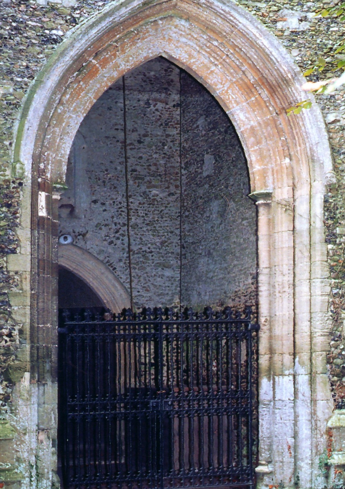 More scope for uncertainty is provided by the tower (shown below left, viewed from the southeast), though what cannot be in doubt is that this has been influenced by the neighbouring tower at Cotton, some three and a half miles to the west, for both have the extraordinary feature of a lower stage entirely open to the elements through a high W. arch (illustrated below right) that exposes the hardy campanologist to every passing Atlantic gale. The tower at Cotton has bell-openings with flowing tracery in the Decorated style but there are reasons to question whether its construction was later than this suggests. At Wetheringsett, the straightened reticulation units of the bell-openings could be indicative of a date in the third quarter of the fourteenth century, which might imply its construction followed that of Cotton’s tower quite closely. It is also the more impressive work, for its angle buttresses continue the full height, decorated by flint chequerwork on the leading edges and by niches in the northwest and southwest buttresses above the first set-offs.