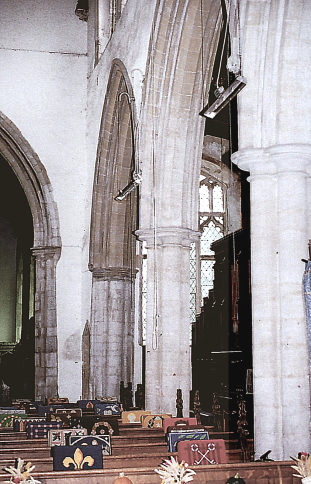 The nave arcades are constructed in four bays and were described by Pevsner as late thirteenth century work (James Bettley & Nikolaus Pevsner, The Buildings of England: Suffolk East, New Haven & London, Yale University Press, 2015, p. 575) - a date that would also fit the doorway inside the porch, with its two flat-chamfered orders, with the outer order springing from circular shafts. However, in the view of this writer, the arcades could well be later than this, and perhaps contemporary with the three-light reticulated window of c. 1320-50 in the S. aisle W. wall. The piers are quatrefoil in section with capitals going all the way round, and the arches bear two hollow chamfers separated by a roll set in a deep hollow - a design presenting a rather diverse assemblage of elements, with the roll more characteristic of the Early English style, and the hollow chamfers more typical of Decorated work, so that, separating styles from periods, it seems likely that this work was executed at the later date. (The S. arcade is illustrated left.)