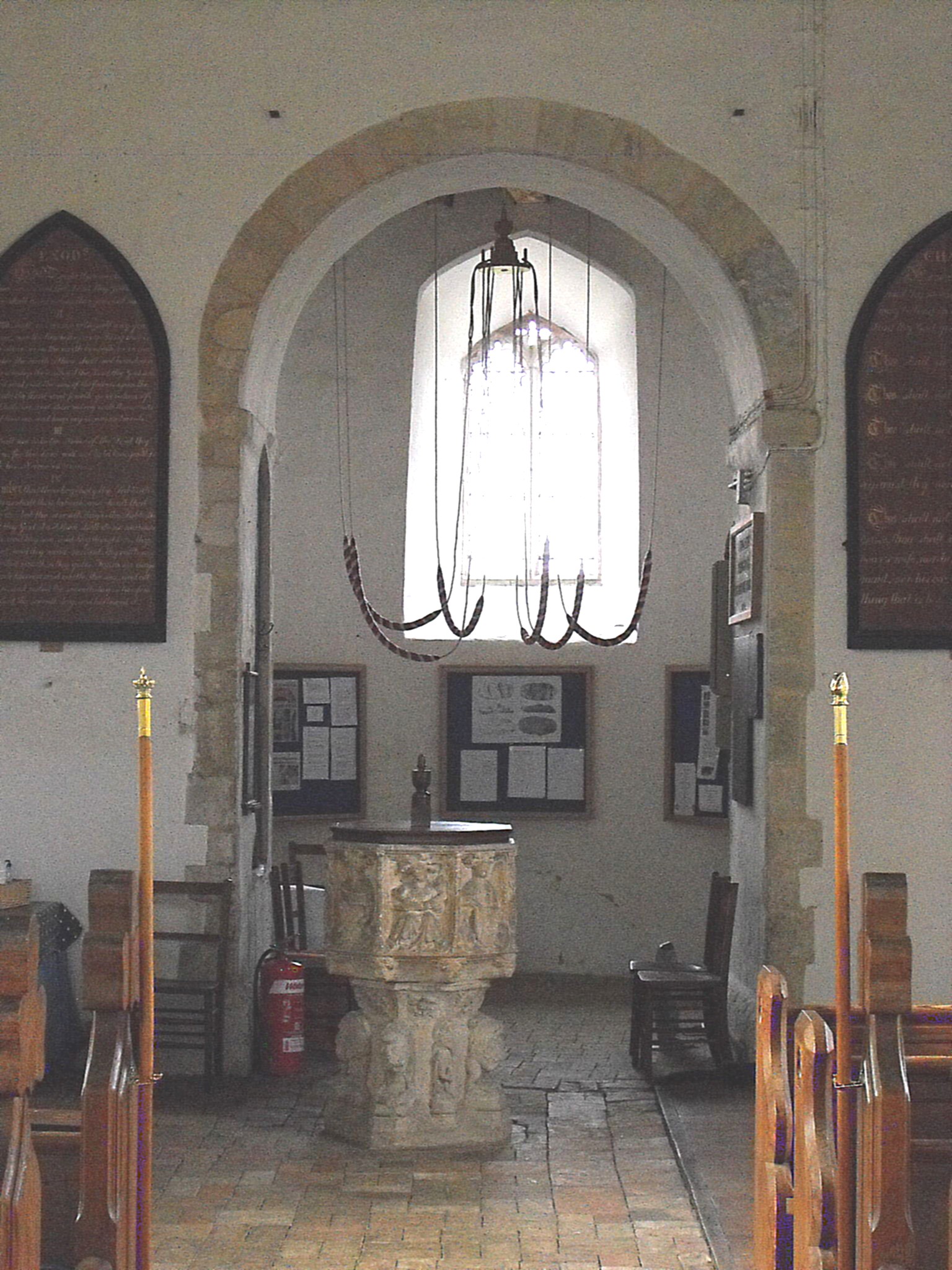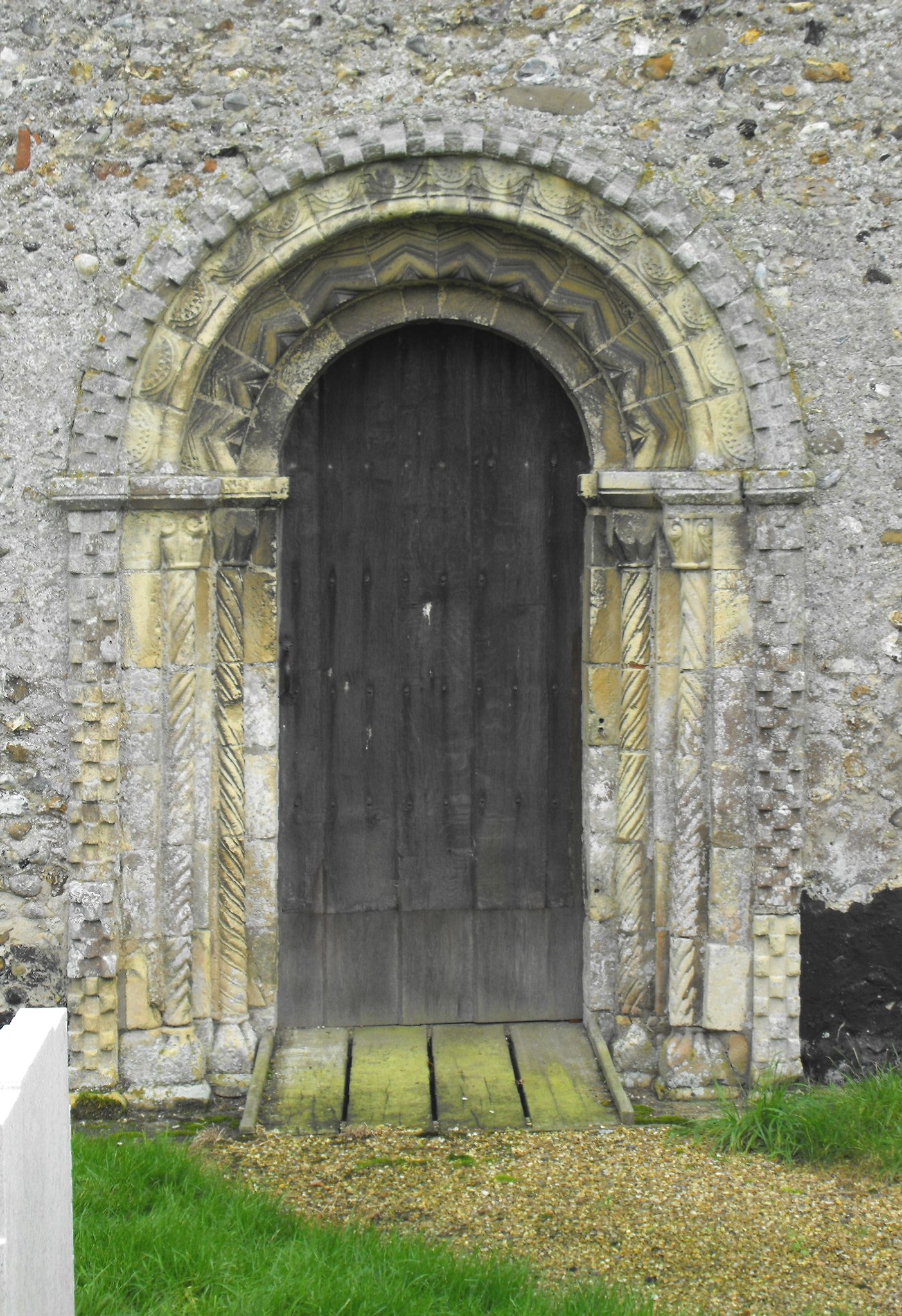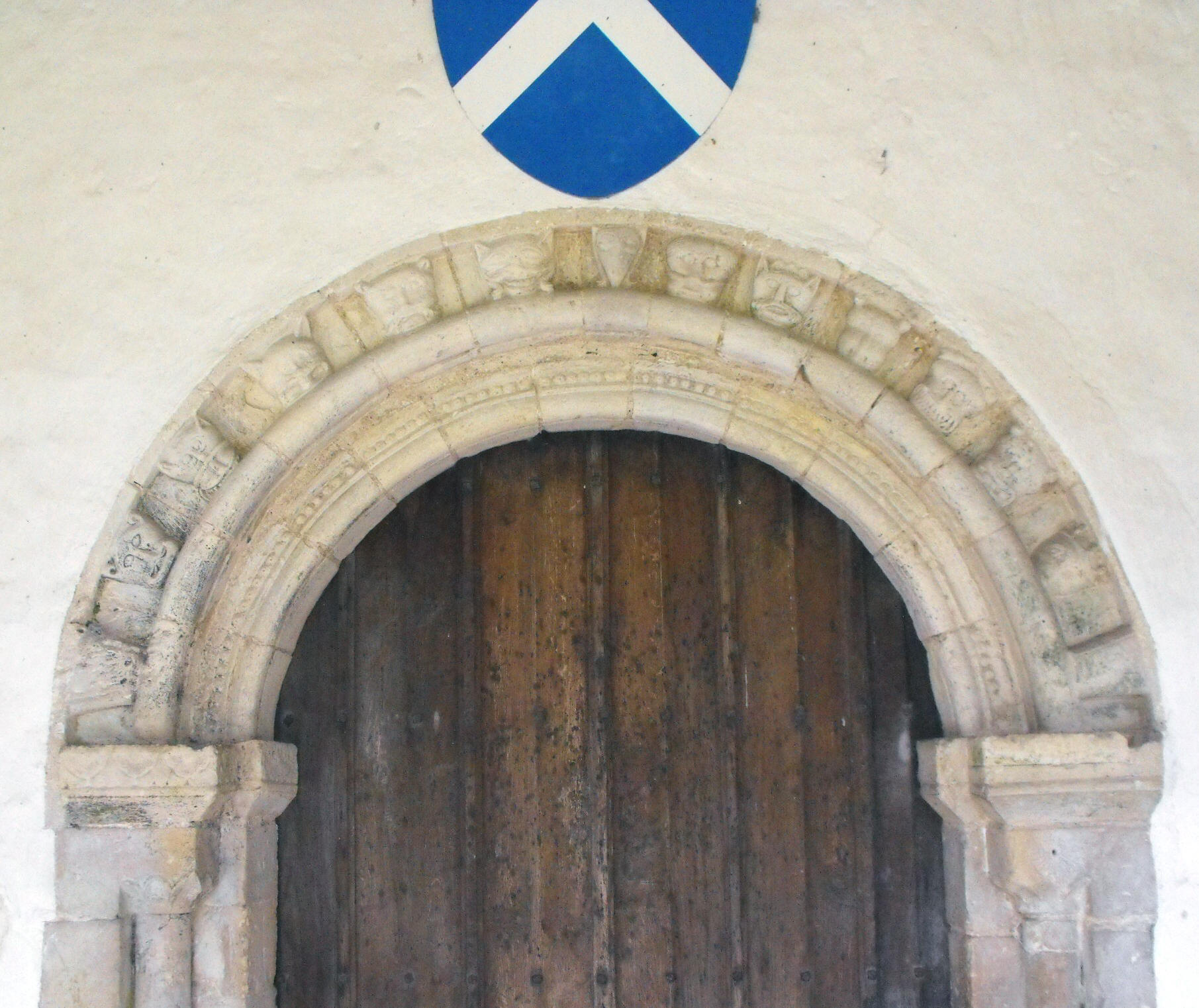 The rest of the church consists of a chancel with a lean-to N. vestry, and a nave with a S. porch. The nave might reasonably be expected to be contemporary with the tower. Its two-light windows in a number of very slightly differing forms, are now all Perpendicular insertions, but its N. & S. doorways are round-arched and Norman and display: (i) within the porch to the south, a couple of rolls, nailhead and a form of beakhead, composed mainly of the heads of cats rather than birds, above a single order of plain shafts (as shown below left); and (ii) to the north, chevron, a roll, and lunette and billet moulding above two orders of shafts with [a], scalloped capitals and spiral moulding to the inner order, and [b] a leaf volute capital and spiral moulding on the outer order to the left, and a leaf volute capital and chevron moulding on the same order to the right (see the photograph below right). Perhaps such mixed designs arose from the involvement of different masons and/or from an interupted process of construction.