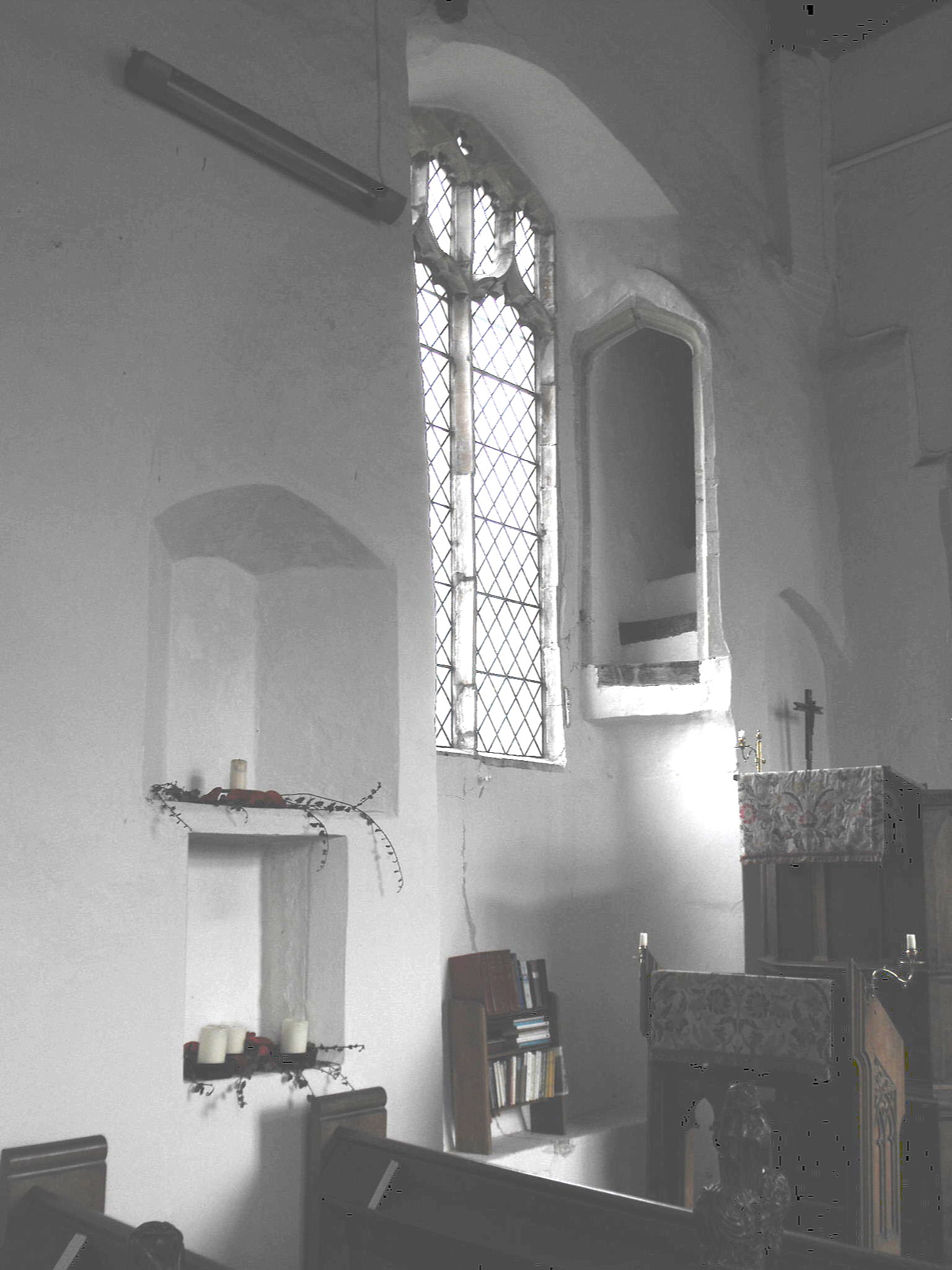 To these various details, it must be admitted the interior adds little. The tower arch has already been mentioned. The chancel arch is Perpendicular and carries wave mouldings above compound responds. However, the really striking feature is the astonishing way in which the entrance to the rood stair begins some 8' (2.4 m.) from the floor, within the window splay of the easternmost nave N. window. (See the photograph below right.) Presumably, this called for the use of another ladder. Thereafter the stair rises for barely half a dozen steps before emerging within the soffit of the chancel arch.