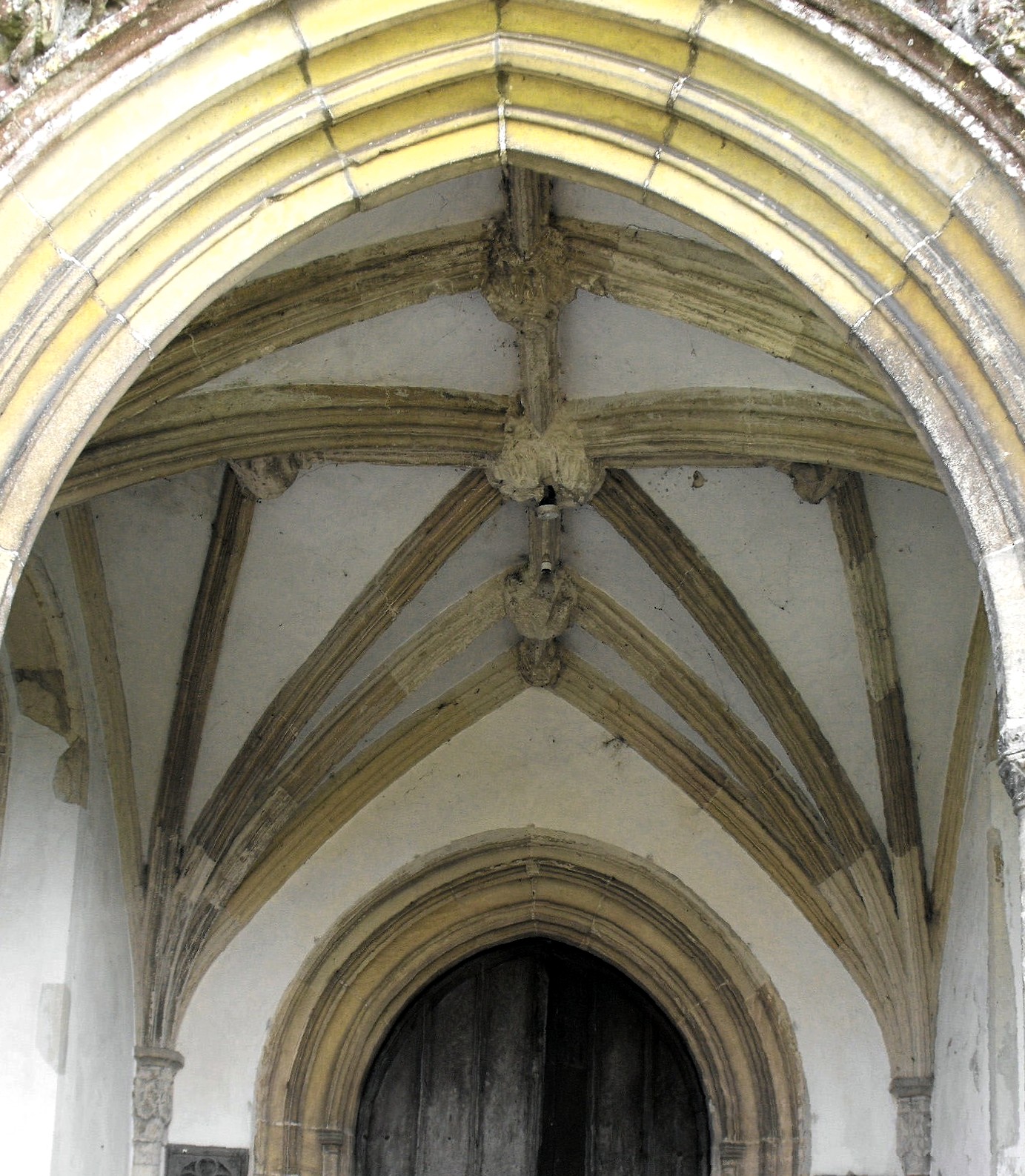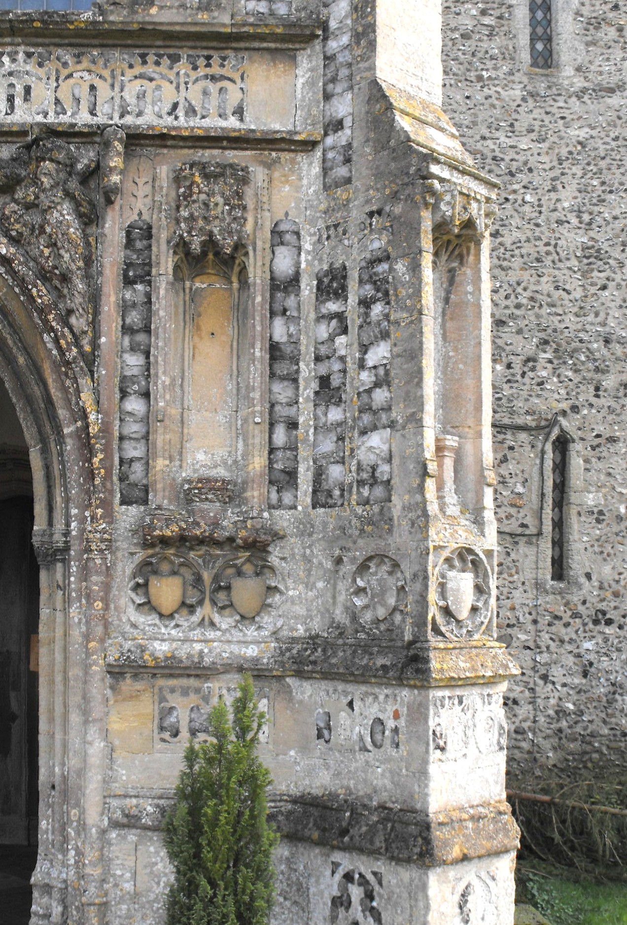 The exceptionally rich N. porch (seen, above right, from the northwest, and again, below left, in order to show the detail around the right hand spandrel of the doorway) is two-storeyed and largely faced in knapped flint. It is lit in the upper storey by two, two-light N. windows with double-cusped lights, a castellated transom immediately on top, and supermullioned tracery with split 'Y's above that, and is replete with carved and flushwork detail that includes a row of crowned 'M's (for St. Mary) above the doorway, a frieze of shields wrapped in scrollwork on the parapet, and pinnacles rising at the angles and midpoints of the walls, on which sit the remains of a set of mutilated beasts and figures. Canopied niches of varying sizes decorate the sides of the doorway, the sides of the upper storey windows and the little space between, and the leading edges of the diagonal buttresses. These last also feature flushwork arches on the sides and a row of carved shields in encircled octfoils below. The doorway carries a series of mouldings above jambs with two orders of attached bowtells, and inside the porch, the lower storey is covered by a tierceron vault supported on shafts at the angles, with capitals with long necks (illustrated below right). The inner doorway consists essentially of three orders separated by hollows and has a single pair of bowtells attached to the jambs.
