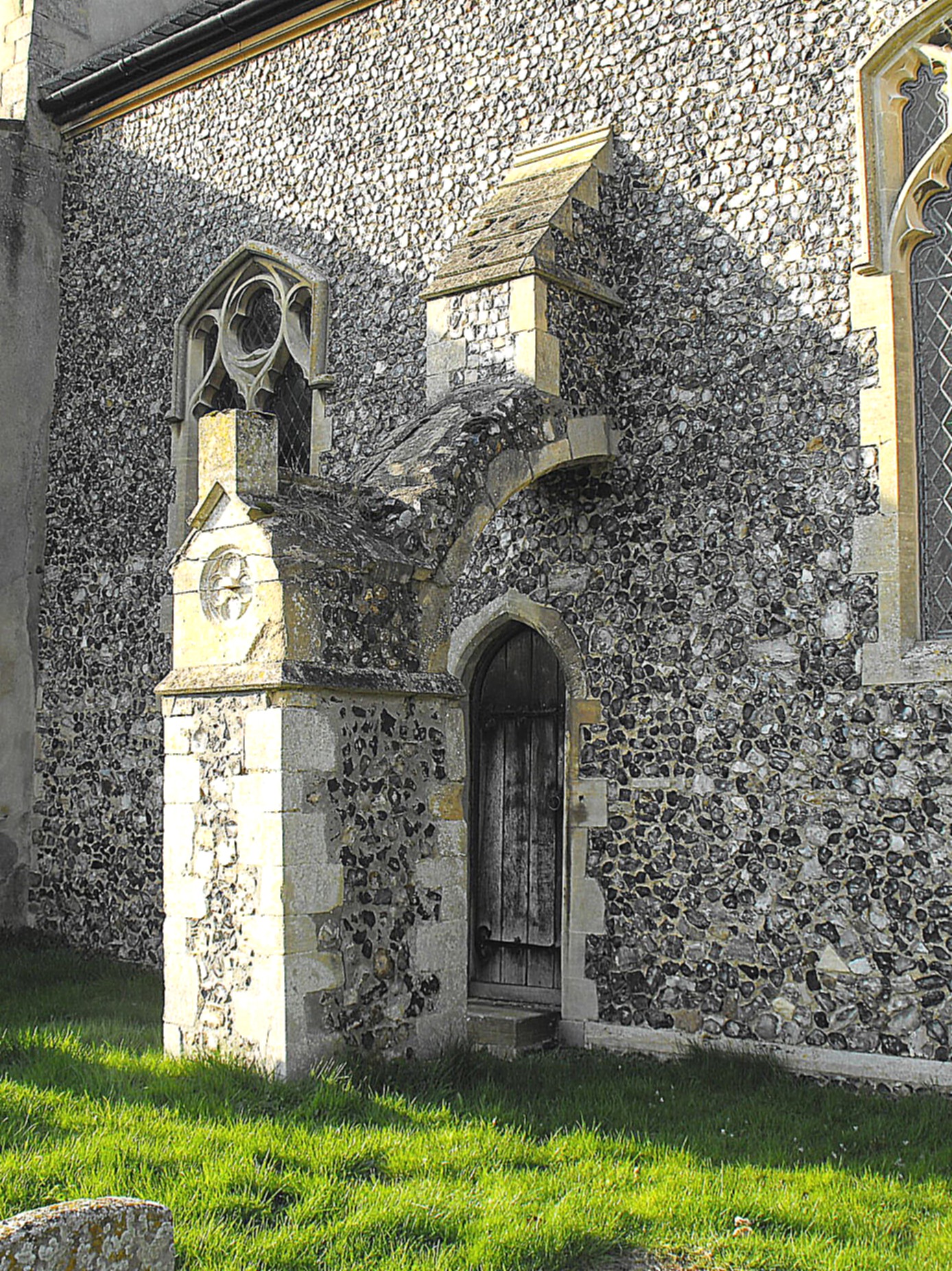 This is a building in a mix of Decorated and Perpendicular styles, with a small S. porch of 1854 by John Johnson of Bury St. Edmunds and a chancel largely rebuilt in 1868. The mediaeval parts of the church consist of the W. tower, the nave with its S. aisle, and the much grander N. porch, but the tower is probably earliest - the work, perhaps, of c. 1300 to judge from its Y-traceried bell-openings and the extremely narrow cusped slit openings below to north and south. The short nave is only three bays long, with three-light Perpendicular N. windows with supermullioned tracery each featuring a pair of quatrefoils above the main mullions, two two-light supermullioned S. windows differing greatly in width, and a clerestory formed of six two-light windows on each side (i.e. two per bay) with depressed cinquefoil-cusped Y-tracery. The chancel now features a rather flimsy flying buttress over the priest's doorway to the south (shown below left), like those at Eye and Little Stonham, which must surely represent an original feature.