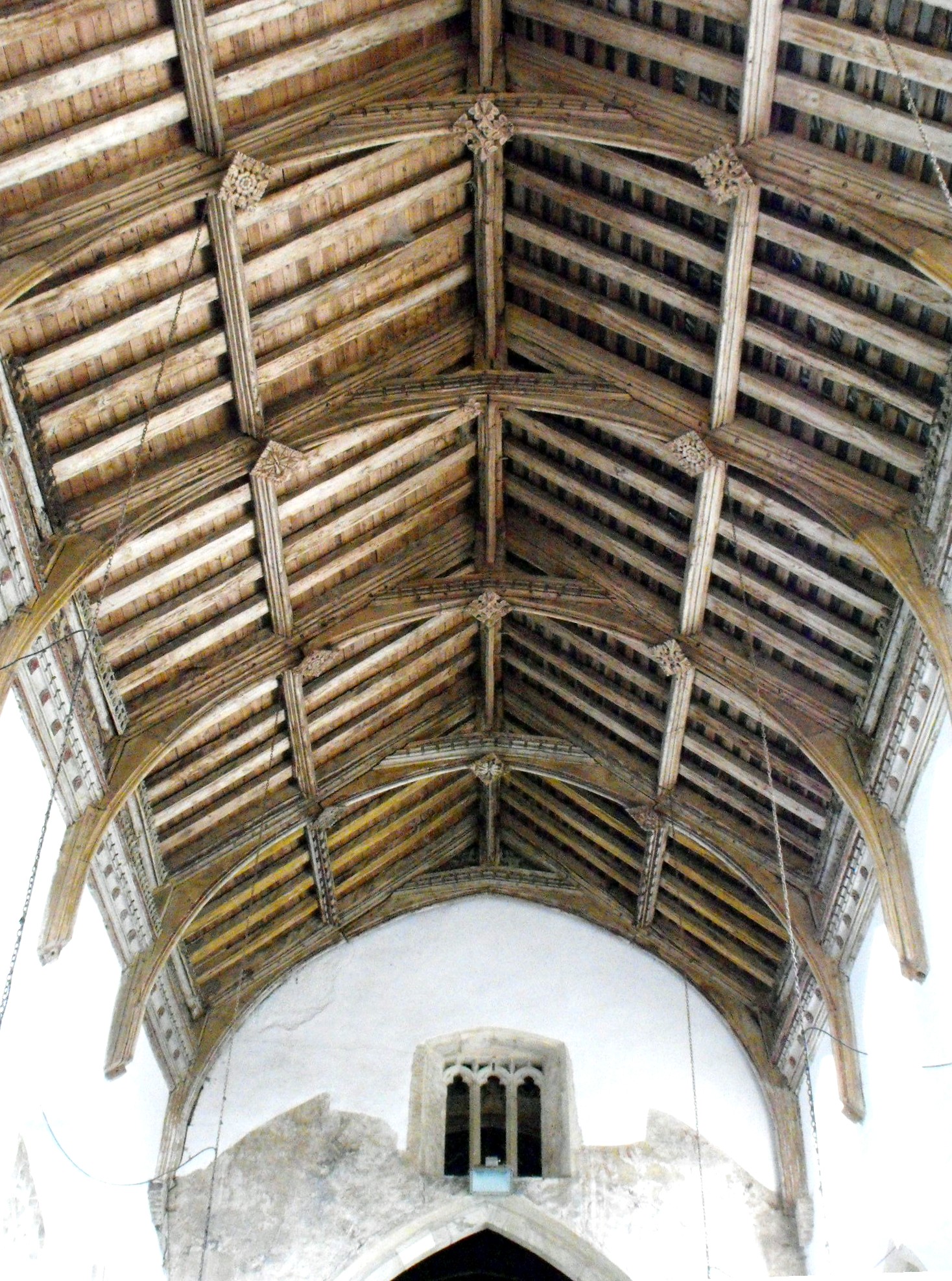 Specific features to notice within the building should begin with the hexagonal pulpit (illustrated below right) which, though not the earliest, must surely be the best. This has a carved tester with pendants at the angles and bears the date '1635' on the fretwork crest to the southwest (towards the camera). Four tiers of panelling decorate the sides, of which the third features the standard Jacobean arches, the top rail is carved with a kind of inverted gadrooning, and the backboard is adorned with fretwork dragons at the sides. The dado beneath the rood screen is carved with blank arches which were once painted and gilded with figures of saints that have now all but disappeared, although their apparently all-female cast reputedly included SS. Mary Magdalene, Barbara, Dorothy and Cecilia to the south, and SS. Ursula and Katherine to the north (church guide). The nave roof (seen below left, from the west) appears to be partly original and consists of six bays (or three, each subdivided into two), with arched braces, castellated wall plates, and nicely-carved bosses where the principal rafters cross the purlins.