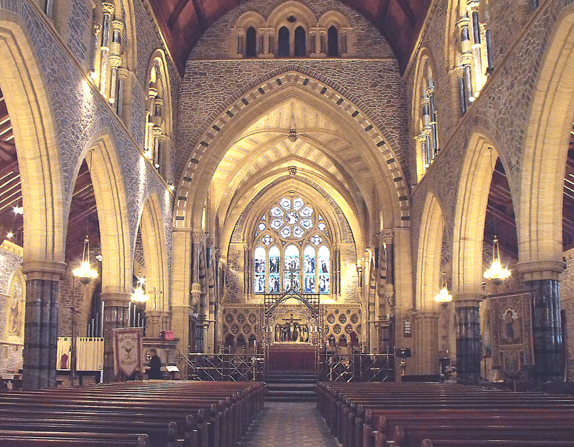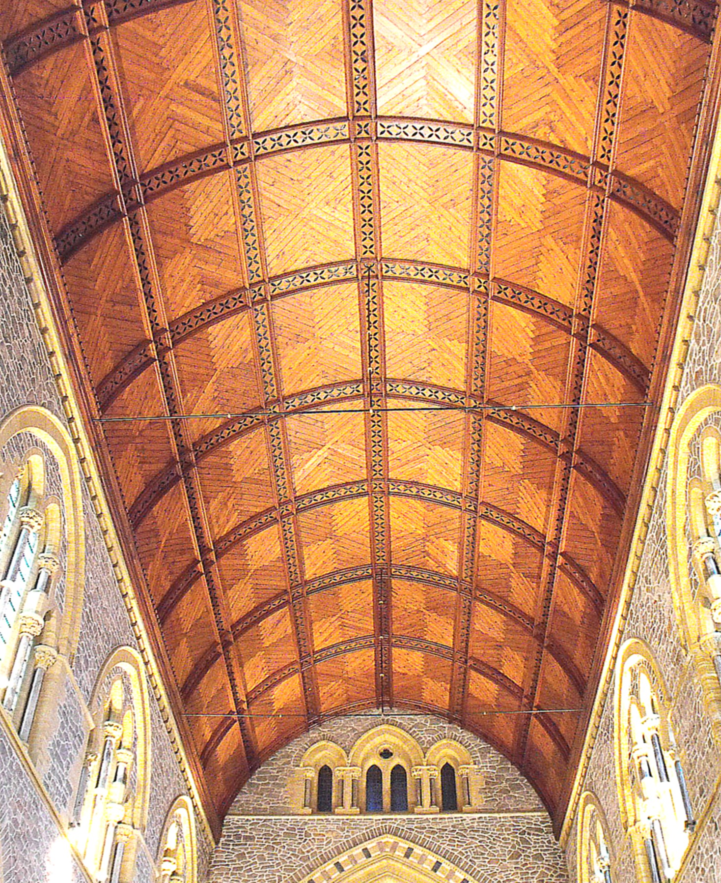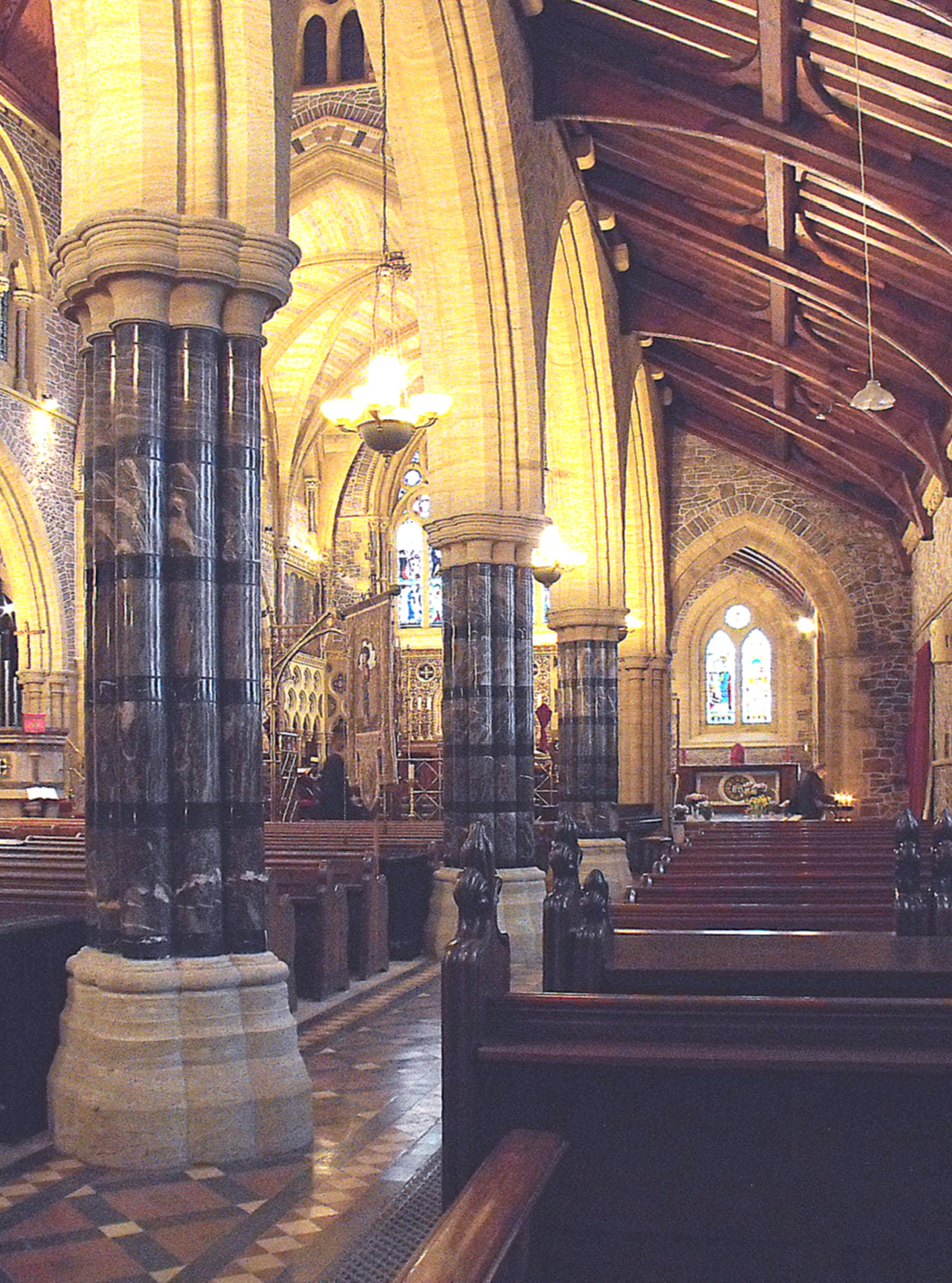 This is particularly evident in the lavish use of materials. The aisle walls and the nave walls above the arcades are faced with irregular pieces of stone in varying shades of brown and grey, given a 'crazy paving' effect by thick bands of mortar between. (See he general interior view from the west, below left, and the view along the S. aisle, below right.) The four-bay aisle arcades are composed of arches of three orders bearing two flat chamfers separated by a roll, springing from piers formed of clusters of eight shafts constructed of grey marble with black bands. The positions in the N. aisle wall corresponding to the S. aisle windows, are filled with mosaics illustrating the life of St. John, commissioned by Street from the studio of Antonio Salviati of Murano, Venice (anon, Parish Church of St. John the Apostle, Torquay, undated, p. 7), to provide an exceptionally literal Italianate element to the building, even by Street's standards. The clerestory windows are separated by black marble shafts in shaft-rings and the nave roof (seen at the foot of the page, on the left) takes the form of a wooden barrel vault divided into rectangles by bands inset with black pointed quatrefoils.
