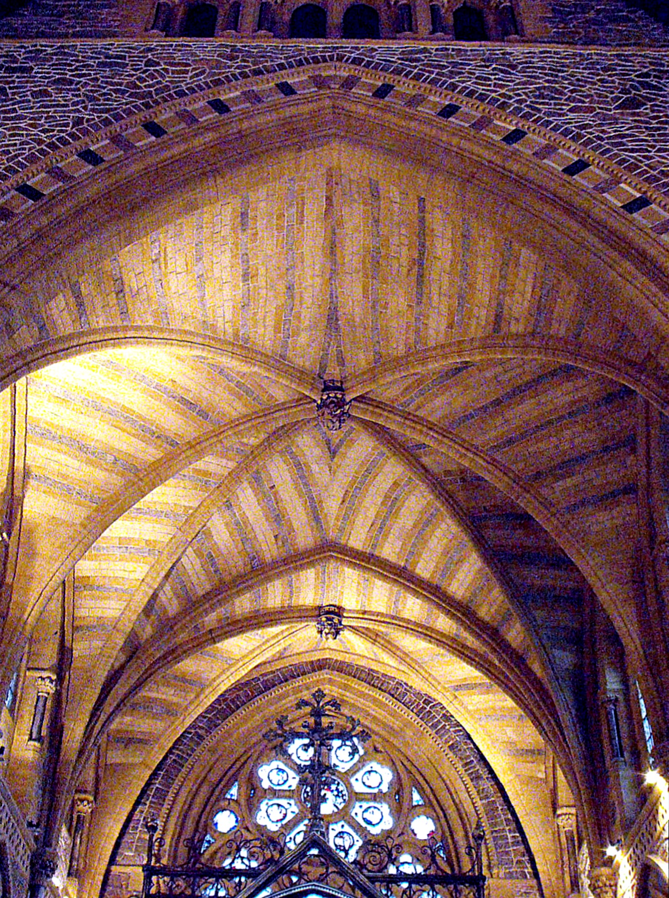 The chancel arch is supported on tall marble corbel shafts with figure carving on the corbels and leaves deeply cut in the capitals, while the arch itself carries a series of hollows of which the outer one is continuous down the jambs. A two-light central window above the arch and a single light on each side (seen above left), look through into the space above the chancel vault. The two-bay arcades between the chancel and chapels are composed of double-flat-chamfered arches with stones of alternating colours forming the outer order, and a hood-mould with dog-tooth moulding, supported on central piers composed of eight marble shafts. (The photograph below left shows the S. chapel arcade.) The chancel vault consists of a sexpartite bay over the choir and a quadripartite vault over the shallower sanctuary (as illustrated below right). However, here again it is the constructional colour that is especially telling, with the golden Ham Hill stone from Somerset now contrasted with darker Caen stone from France (Parish Church of St. John the Apostle, p. 6), an example of Street's preparedness to bring building stone from anywhere in Europe if it suited his purpose, as he was happy to confess in Brick and Marble (pp. 283-284): 'It must never be forgotten by us that our forefathers had very limited means of obtaining materials from one locality and transporting them to another; and were moreover, to a great extent, unacquainted with the materials which might, if necessary, be obtained. We have not this excuse: we not only know what materials we may obtain, but we have at the same time marvellous facilities for their conveyance between all parts of the country, and we also know how much has been done of old in other countries by using them in the proper way.'