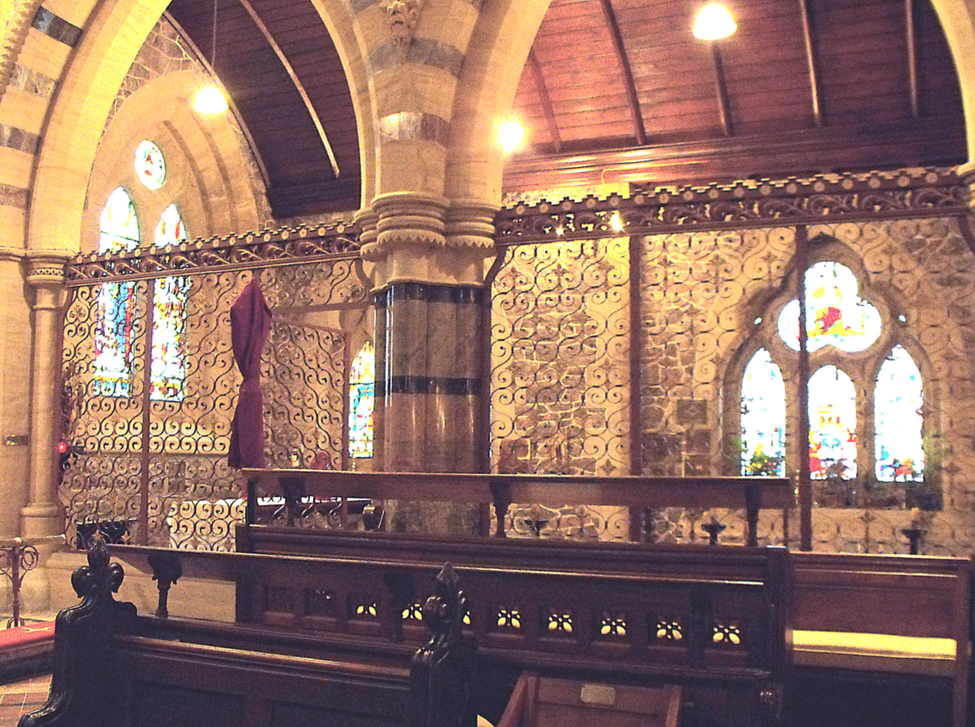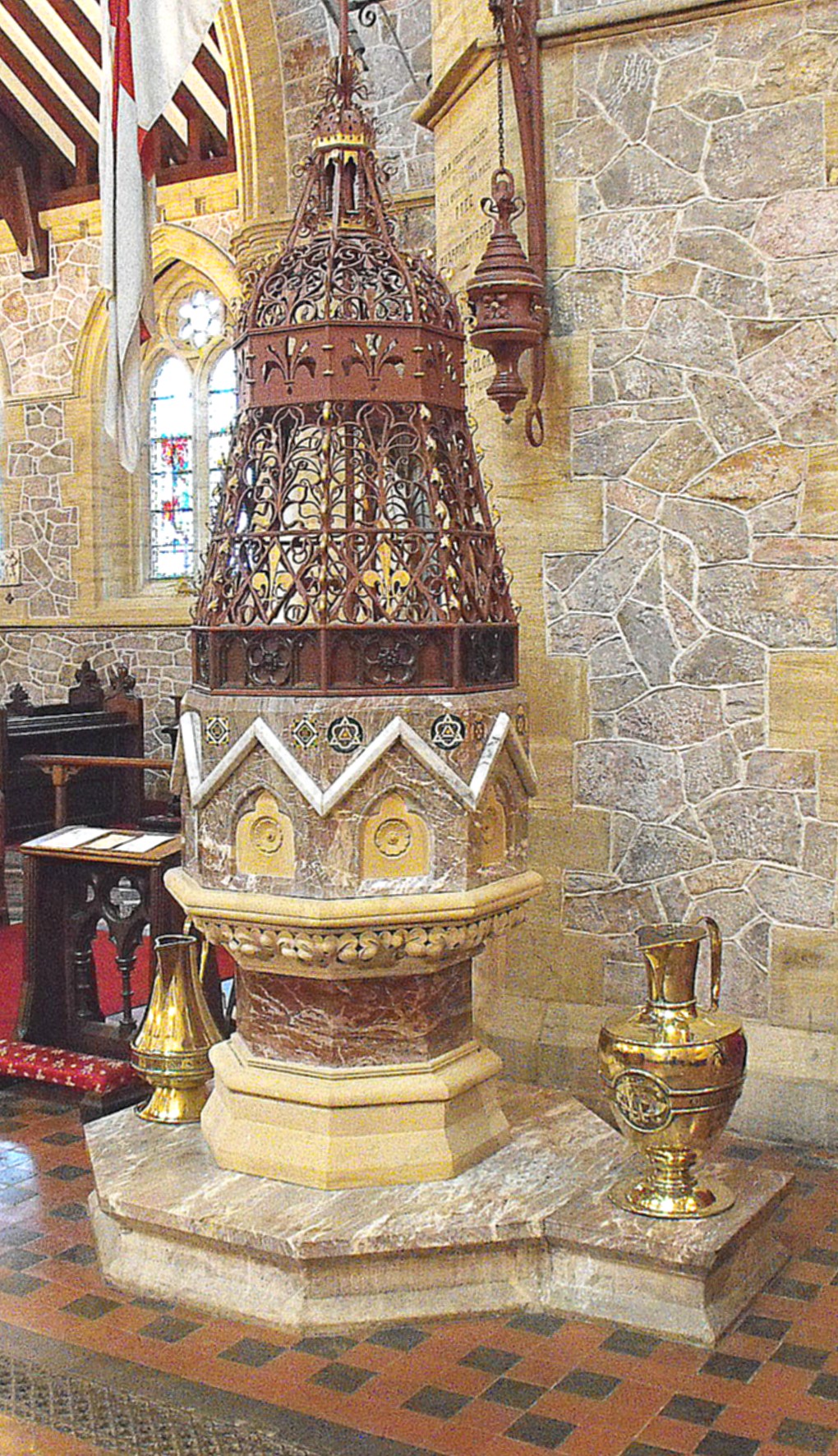 Furnishings in the church include the octagonal font in coloured marbles, with blank arches beneath a zigzag moulding and tiny inlaid patterns above, standing on a marble octagonal base. (See the photograph below right.) The pulpit is a comparatively simple affair for Street, consisting of a drum with inlaid marble patterns on the west and northwest faces only, standing on a wide stone base with marble shafts inset in the angles. A fine and particularly elaborate iron parclose screen (seen in the photograph above left), also designed by Street, fills the arches between the chancel and S. chapel, with each of its two sections being made up of three divisions. There is a low brass screen between the nave and chancel which suddenly steps up to form an arch over the centre and to support a brass cross.