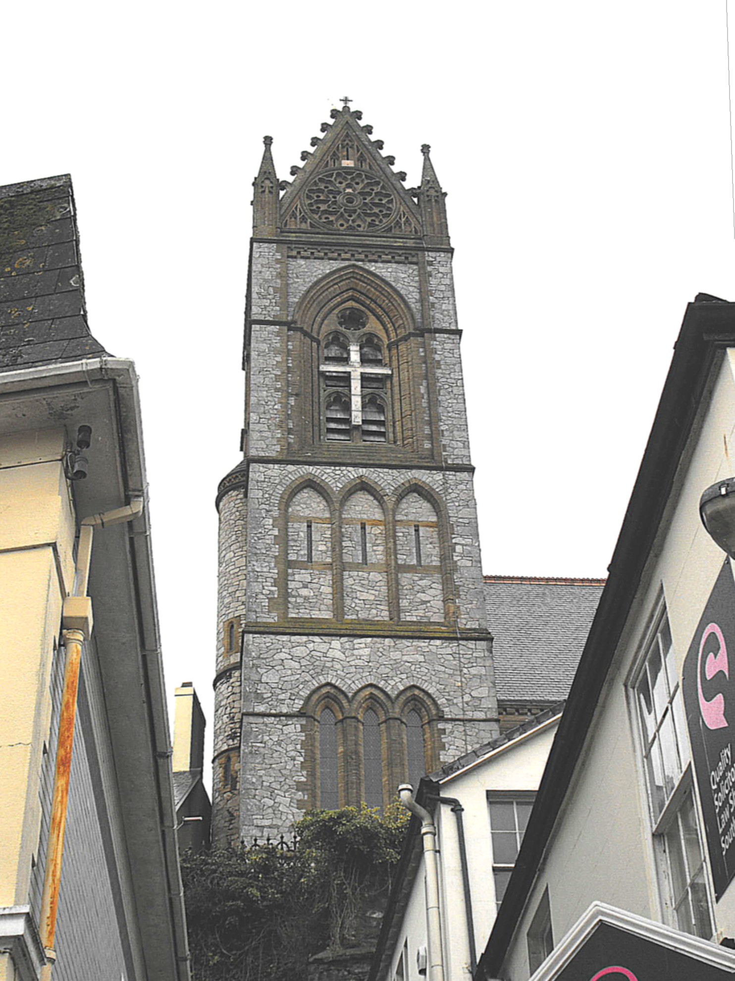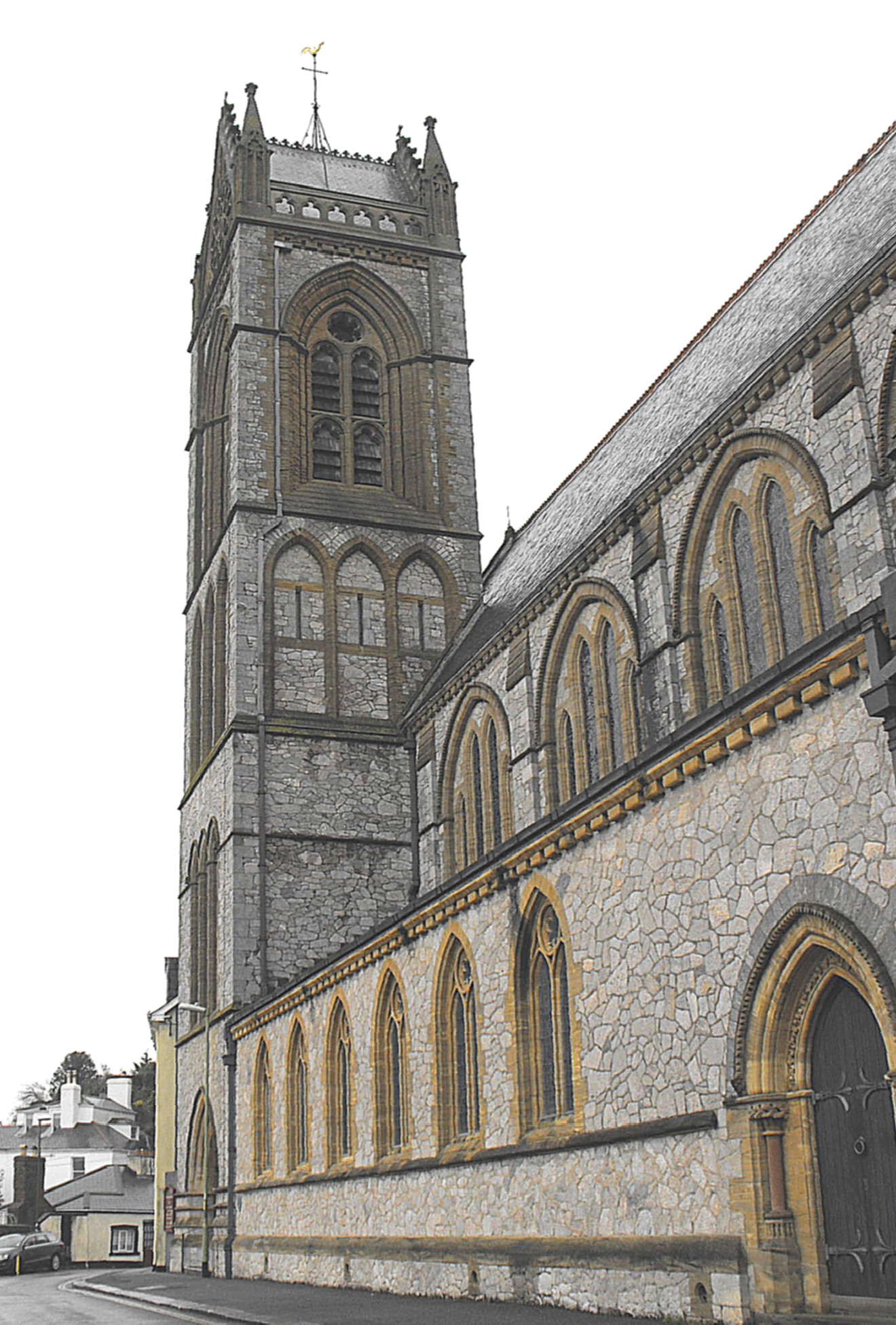 This is another of Street's town churches erected in a tightly constricted position - in this case, on a site cut out of the hillside behind and above one of the main streets facing the seafront in Torquay. The building in consequence has no churchyard, no N. windows, and very little space between the east end of the chancel and neighbouring St. John's House, thereby delegating all the responsibility for its visual impact on the S. front and southwest tower (seen left, from the southeast, and below, up an alleyway from the south). The tower rises in three stages and is topped by a helm roof, like those Street observed in Switzerland. on his way to Italy in 1853 and subsequently described in Brick and Marble. Its striking appearance ensures it stands out above the close-packed houses and shops below and perhaps excuses its alien appearance in this Victorian seaside town.