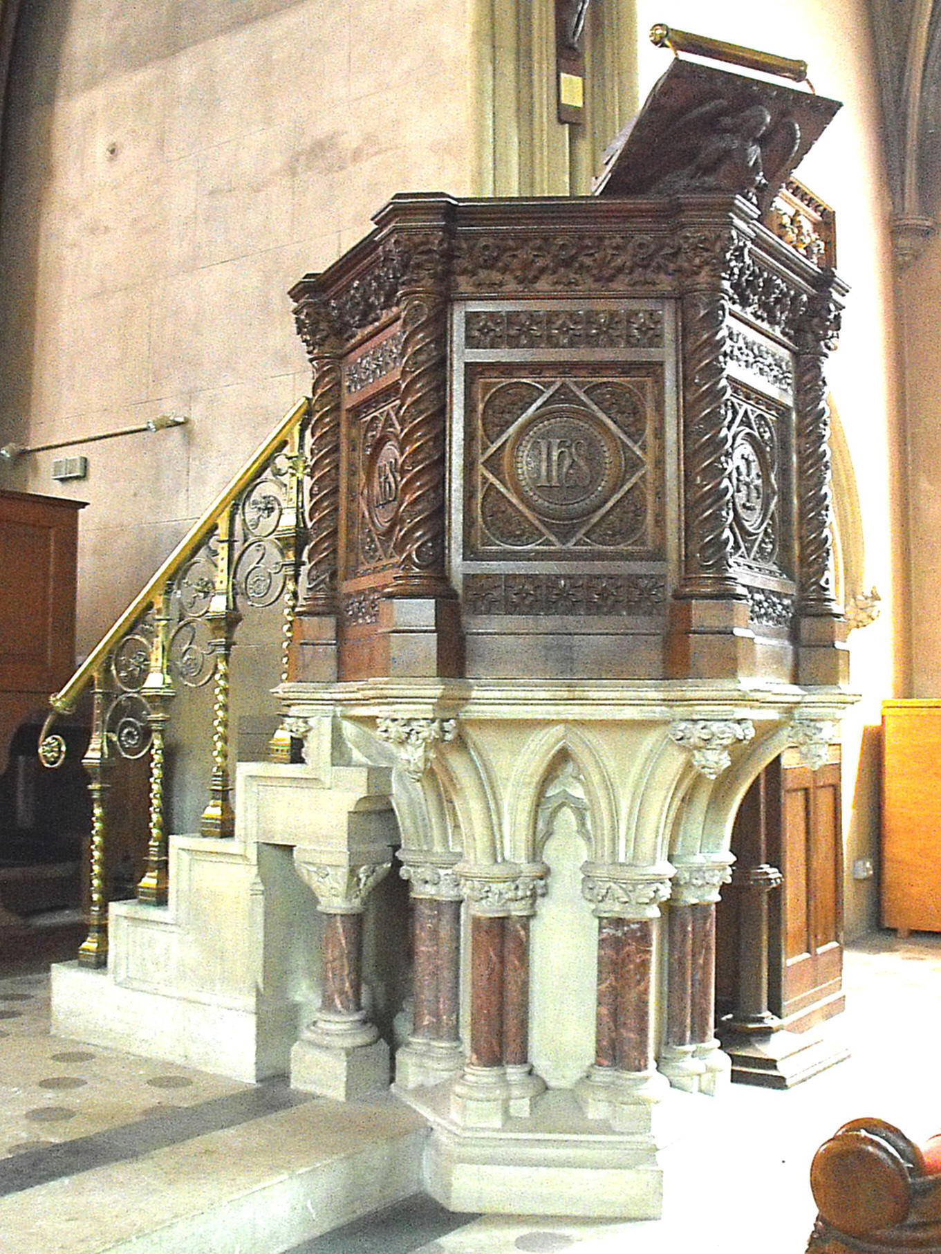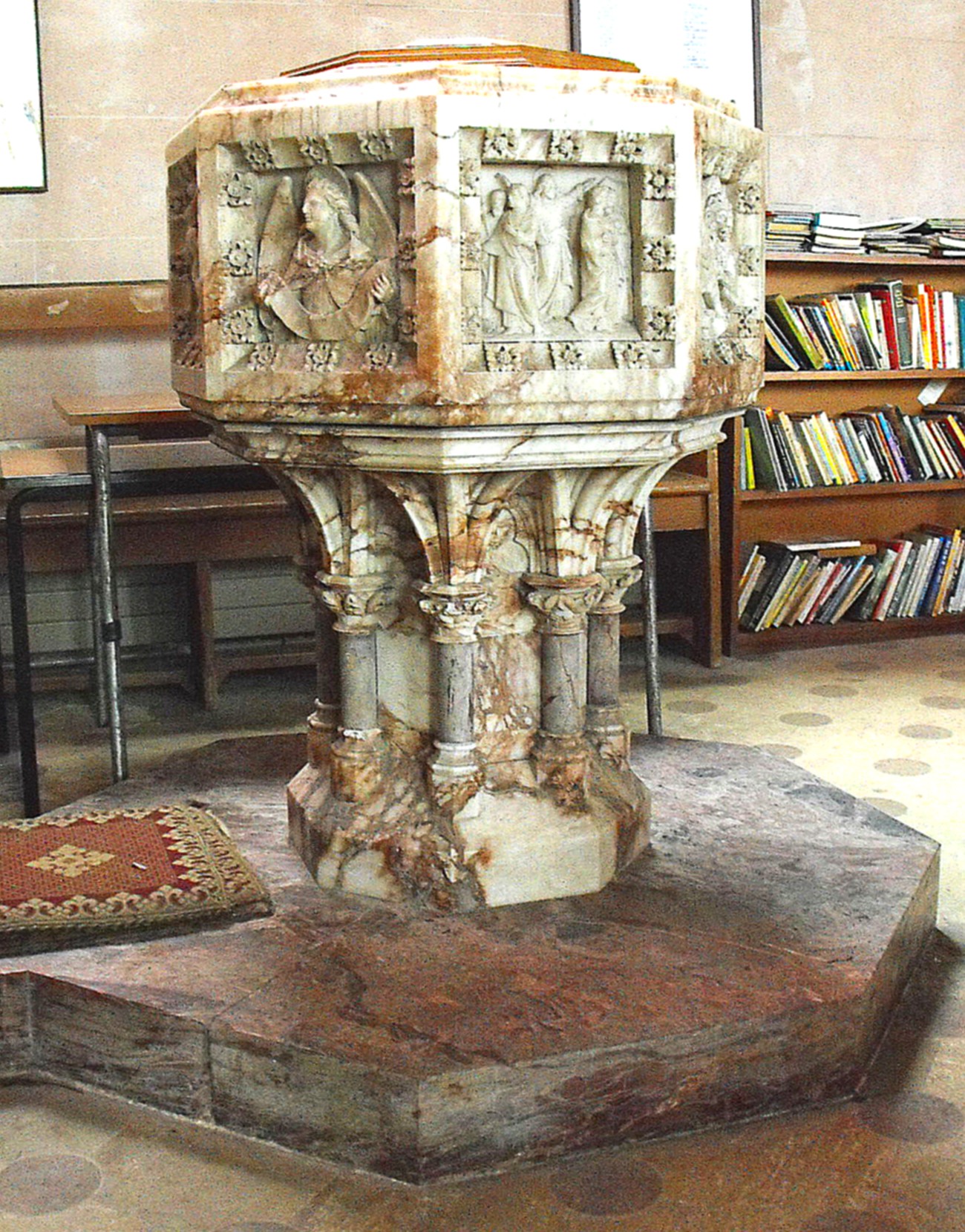 Finally, it remains briefly to describe the pulpit and the font. The drum of the former is constructed of wood, elaborately carved, but the stem is cut from white stone, to which groups of three small brown marble shafts have been added at the corners to give support to the little vaulted arch spaces in between. The font is entirely carved from a piece (or pieces) of brown-veined marble and is decorated round the bowl with the traditional symbols of the Evangelists (an angel for St. Matthew, a lion for St. Mark, an ox for St. Luke, and an eagle for St. John), alternating (on the cardinal sides) by four Biblical scenes, probably to be interpreted as: to the east, St. John the Baptist baptising converts; to the south, the Passion; to the west, possibly Adam and Eve; and to the north, possibly the Transfiguration.