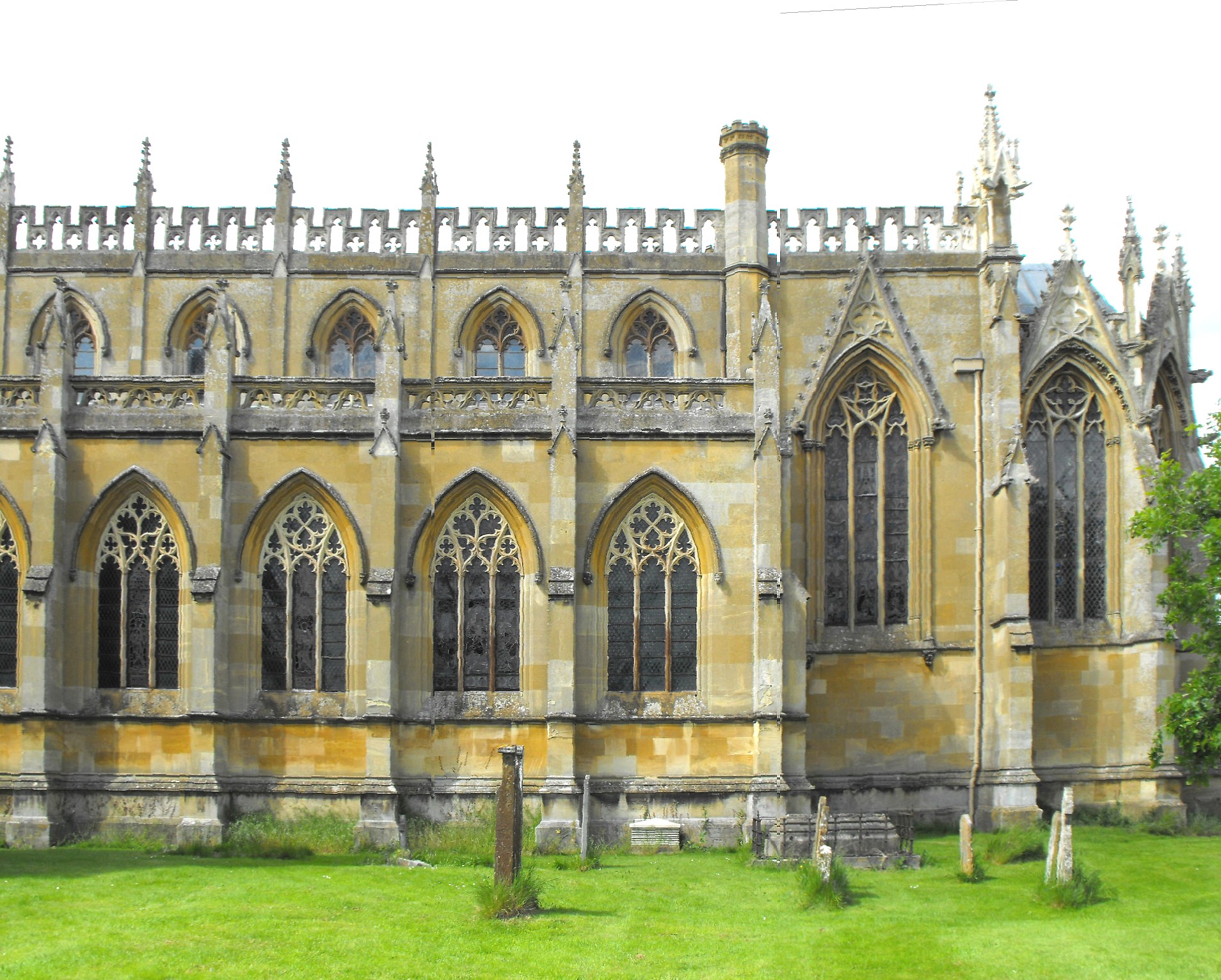Built in 1822-26 to the designs of Thomas Rickman (1776 -1841) and his partner Henry Hutchinson (1800 - 1831), Pevsner described this building (seen above, through trees from the south) as the firm's 'magnum opus' (The Buildings of England: Warwickshire, Harmondsworth, Penguin, 1966, p. 305). The cost was in excess of £9,000 - a very considerable sum at the time yet modest enough for a church of such pretensions, vaulted, as it is, internally throughout. It did not at that time include the fine polygonal apse admittedly, which was a later addition by Sir George Gilbert Scott (1811-78), yet Rickman and Hutchinson's building comprised a soaring W. tower with an entrance porch beneath, a very tall aisled nave constructed in six bays, a massively built, two-storeyed N. porch with a large octagonal stair turret in the re-entrant with the aisle, and a chancel, all of which excel in one or more ways, whether through height, in the elaboration of their window traceries, or by their carved ornament or delicacy of their vaulting schemes, and all show a precocious understanding of mediaeval Gothic architecture (or, at any rate, the Decorated phase of it) following hard on the heels of the publication in 1817 of Rickman's ground-breaking study, An attempt to discriminate the styles of architecture in England (London, John Henry Parker) - an understanding, however, not always so much in evidence in some of Rickman's cheaper churches elsewhere. True, not everything here at Hampton Lucy is always what it seems - Pevsner recorded, for example, that some of the window tracery is made of cast iron - but if it is the final effect that matters most, Rickman and Hutchinson registered here a remarkable success.