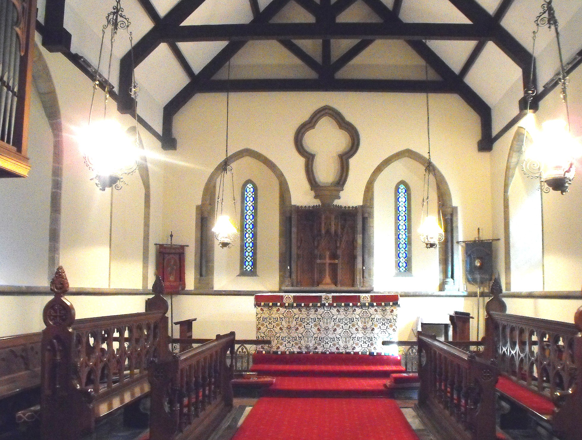 The oldest part of the church appears to be early Norman, though that is only apparent now in small sections of masonry in the nave walls, set herring-bone wise (most notably inside, to the left of the transept arch), and in the blocked round-arched N. doorway (only visibly internally). Notwithstanding the church guide, the chancel is not late Norman but Early English work of c. 1220. There are two lancets in each of the N. and S. walls, which are original inside, and two more in the E. wall which Ian Nairn said are not (ibid.). (See the internal view looking east, below right.) The chancel arch is double-flat-chamfered with the inner chamfer rising from corbels. There is a small piscina recessed in the S. wall of the sanctuary but no sedilia. The S. tower, again in spite of the church guide which claims this too is late Norman, is actually late fourteenth century work at the earliest, as shown by the moulded capitals to the tower arch responds, though the arch itself is merely double-flat-chamfered again. The tower rises in two stages with the bell-stage slightly recessed. The square-headed bell-openings are each formed of two trefoil-cusped lights. The steeply pointed, shingled, broach spire must be recent work since it did not exist when Ian Nairn visited the building in 1965. The N. transept appears to be wholly Victorian.