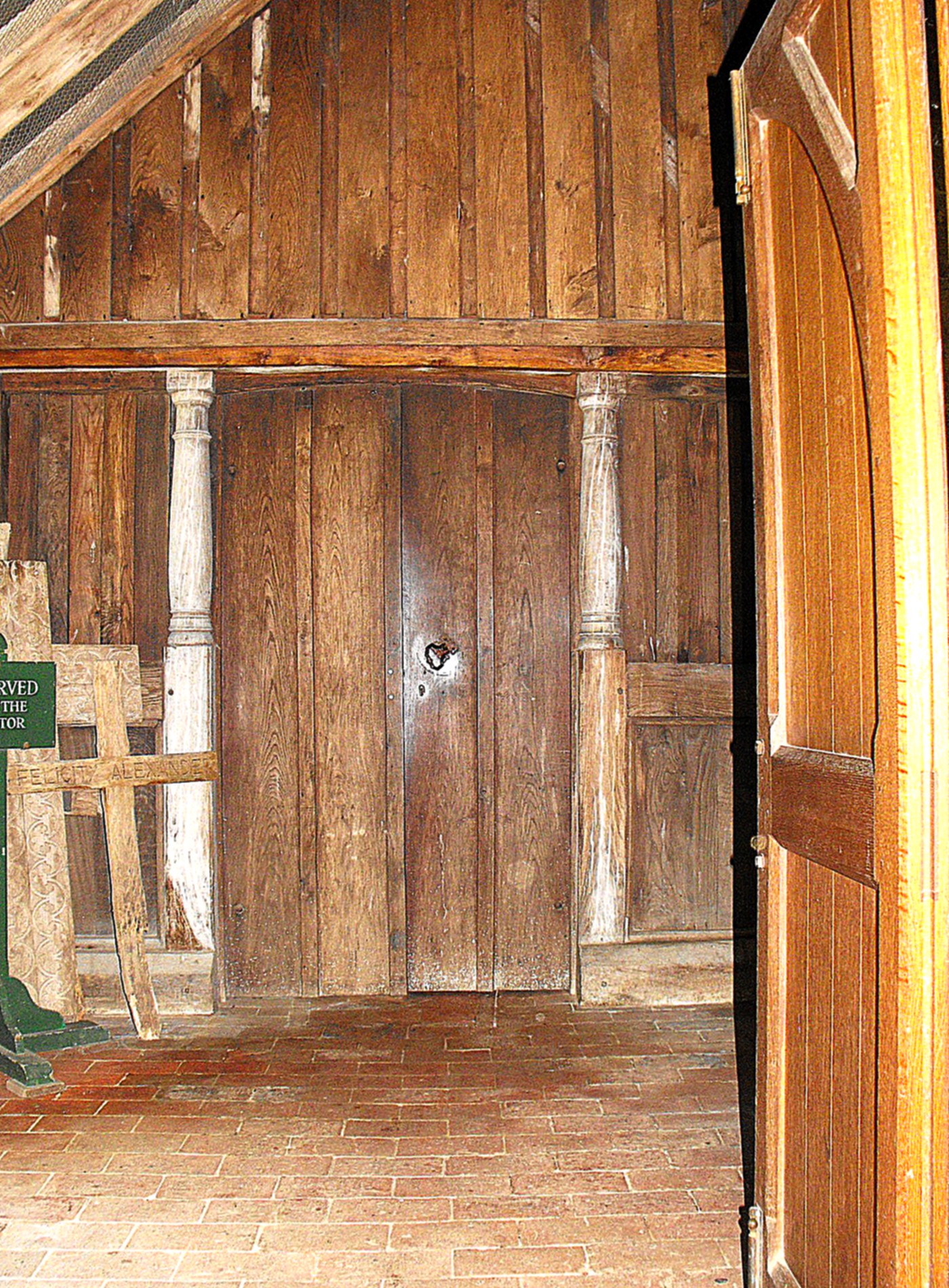 The plan of the building is a curious one for it consists of a chancel, nave and cross-gabled N. transept, with a S. tower adjoining the nave towards the east, and a singular half-timbered 'cloister' (for want of a better term), running from the tower alongside the remainder of the nave to the west. (See the photograph at the foot of the page.) The western half of this 'cloister' now appears to be used as a vestry (although there is also a little lean-to Victorian vestry against the chancel N. wall), while the eastern half serves as a porch, but the 'cloister' was apparently first employed as a meeting place, and afterwards as a school (Ian Nairn, The Buildings of England: West Sussex, Harmondsworth, Penguin, 1965, p. 266). It is believed to have been constructed in the late sixteenth century, though it is a serious challenge to work out which timbers are now original. They probably include much of the roof, the curved wooden lintel above the doorway, many of the mullions between the long row of low, south-facing lights, and the turned columns on either side of the doorway between the sections used as a porch and a vestry. (See the photograph below left.)