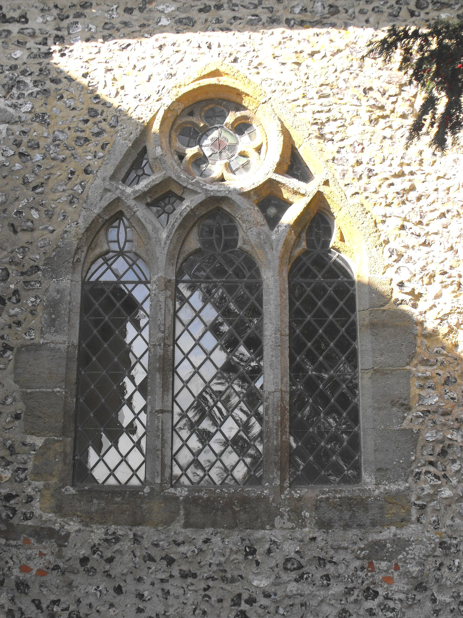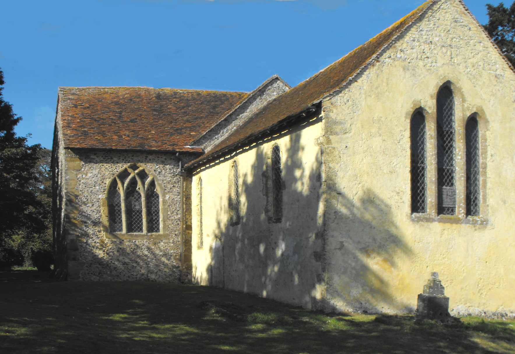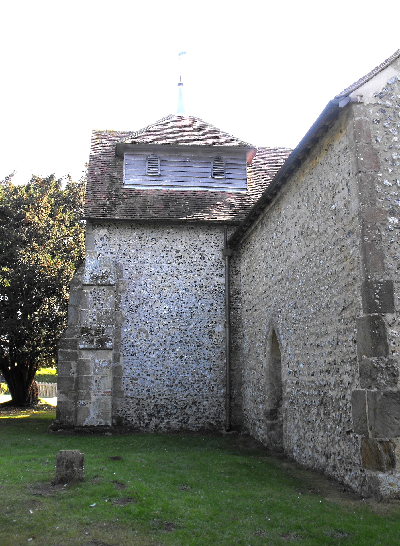 The early thirteenth century work includes the lancet windows in the nave and chancel except for the stepped group of three in the chancel E. wall, which were replaced c. 1910 (Roy Tricker, notes in the church). However, the group of three lancets in an encompassing arch in the nave W. wall is original, and the N. and S. nave doorways are presumably contemporary. By the mid-thirteenth century, therefore, the church must have consisted of a nave and chancel, much as they are now, without any additions. The transepts appear to have been constructed some thirty to fifty years later. The windows are an assortment but the latest appears to be the S. transept E. window with cinquefoil-cusped Y-tracery with the appearance of c. 1300. The S. transept S. window and N. transept N. window are formed of two tall trefoil-cusped lights with an encircled quatrefoil above, and the N. transept E. window (illustrated above left) consists of three short trefoil-cusped lights with an encircled cinquefoil in the head. The S. porch with its brick front, may be an early nineteenth century addition; the curious weather-boarded belfry (shown aove right, in a view of the church looking northwest), scarcely more than three feet high (1 m.) astride the N. transept roof, defies reliable dating, and neither Roy Tricker nor Ian Nairn (in The Buildings of England: Sussex, Harmondsworth, Penguin, 1965, pp. 283-284) attempt it, but that could be early nineteenth century work too.