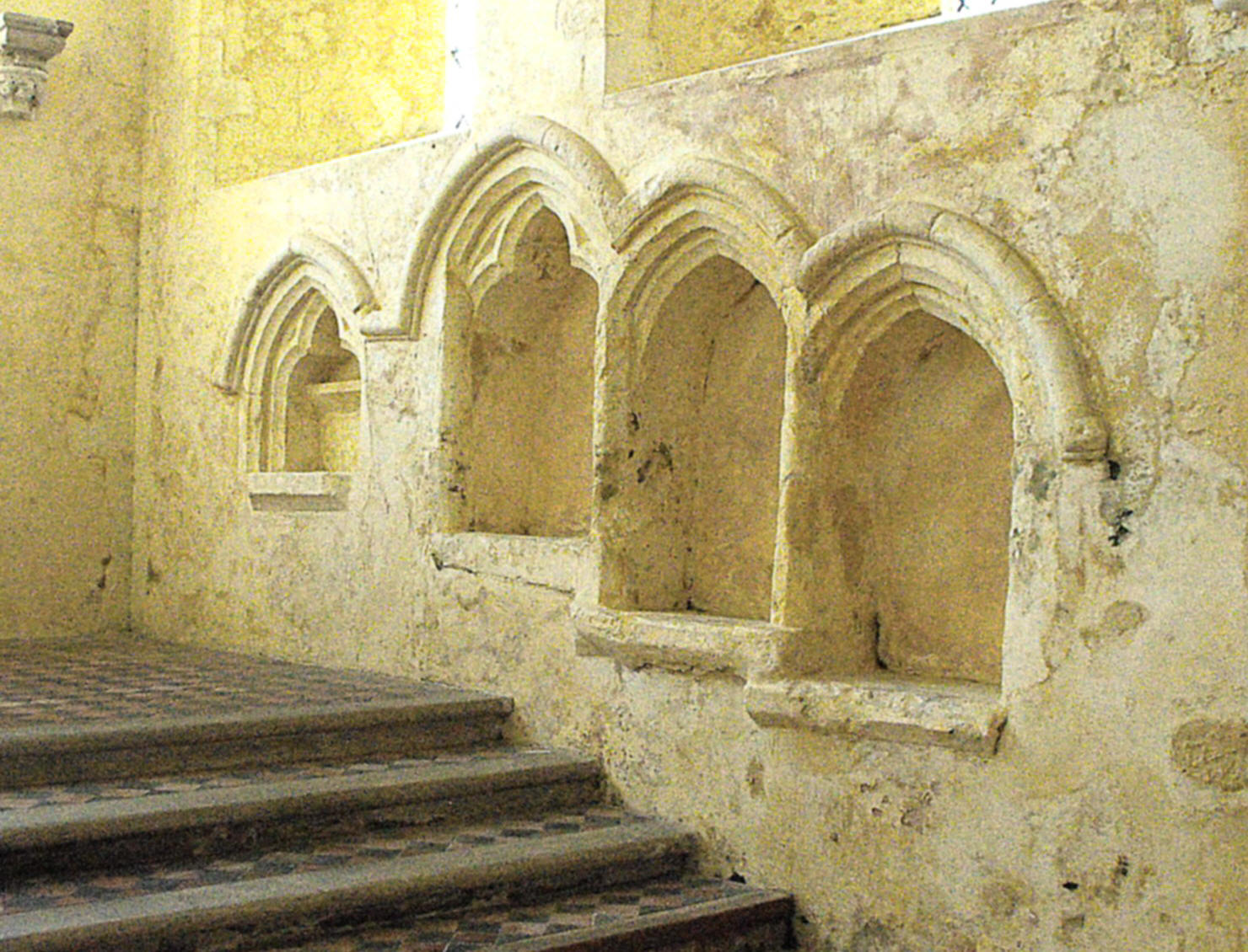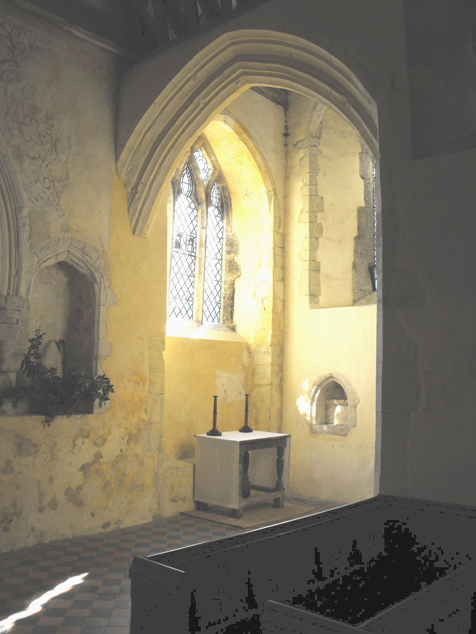 Furnishings in the building include the triple sedilia and piscina in the chancel S. wall (illustrated below), which follow the ascending floor-line as the sanctuary is approached up four steps. The piscina and easternmost arch of the sedilia are trefoil-cusped, and all four arches are united by a single semicircular hood-mould. There is also another piscina in the S. wall of the S. transept. The circular 'tub' font at the west end of the nave, is twelfth or thirteenth century in date. Traces of wall paintings above the chancel arch are too fragmentary to make out but mediaeval carpentry in the church probably includes the chancel stalls and some of the timbers of the collar-beam roofs.