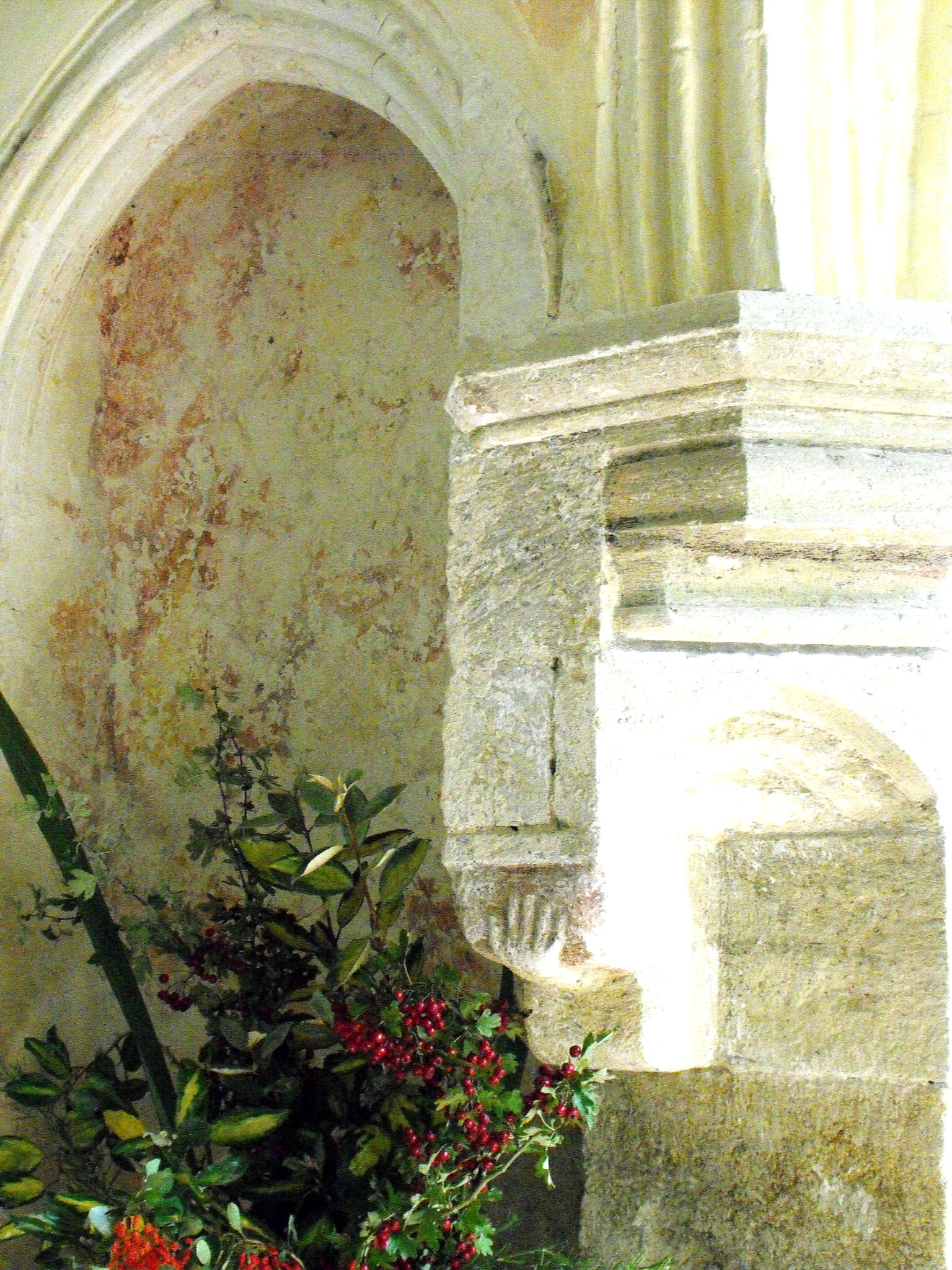 That brings this brief examination of the building to the inside of the church, which is constructed chiefly of clunch. Here, the arches to the transepts and chancel are most significant. The N. transept arch carries a series of flat chamfers that die into the walls, and the S. transept arch (seen above left, viewed from the northwest) is similar except the chamfers are now hollowed, suggesting the date may be a little later. The W. wall of the S. transept features two deep blank arches springing from a corbel between them, carved with an animal looking like a pig but probably correctly identified by Roy Tricker as a sheep, which was probably key to the rural economy in this area in those days and which is still of some local importance today. The chancel arch carries a series of mouldings including rolls with fillets, resting on moulded capitals supported on short rectangular responds. Tiny niches cut into the responds face southwest and northwest, and beyond these, in the east wall of the nave, there are larger blank arches that may once have held statues or even their own altars, entirely additional to the altars that once occupied the large arched recesses in the east walls of the transepts. Between the niche and the blank arch to the north of the chancel arch, the wall is supported on another corbel, carved beneath in the form of a human hand. (See the photograph of the chancel arch N. respond, above right, viewed from the southwest.)