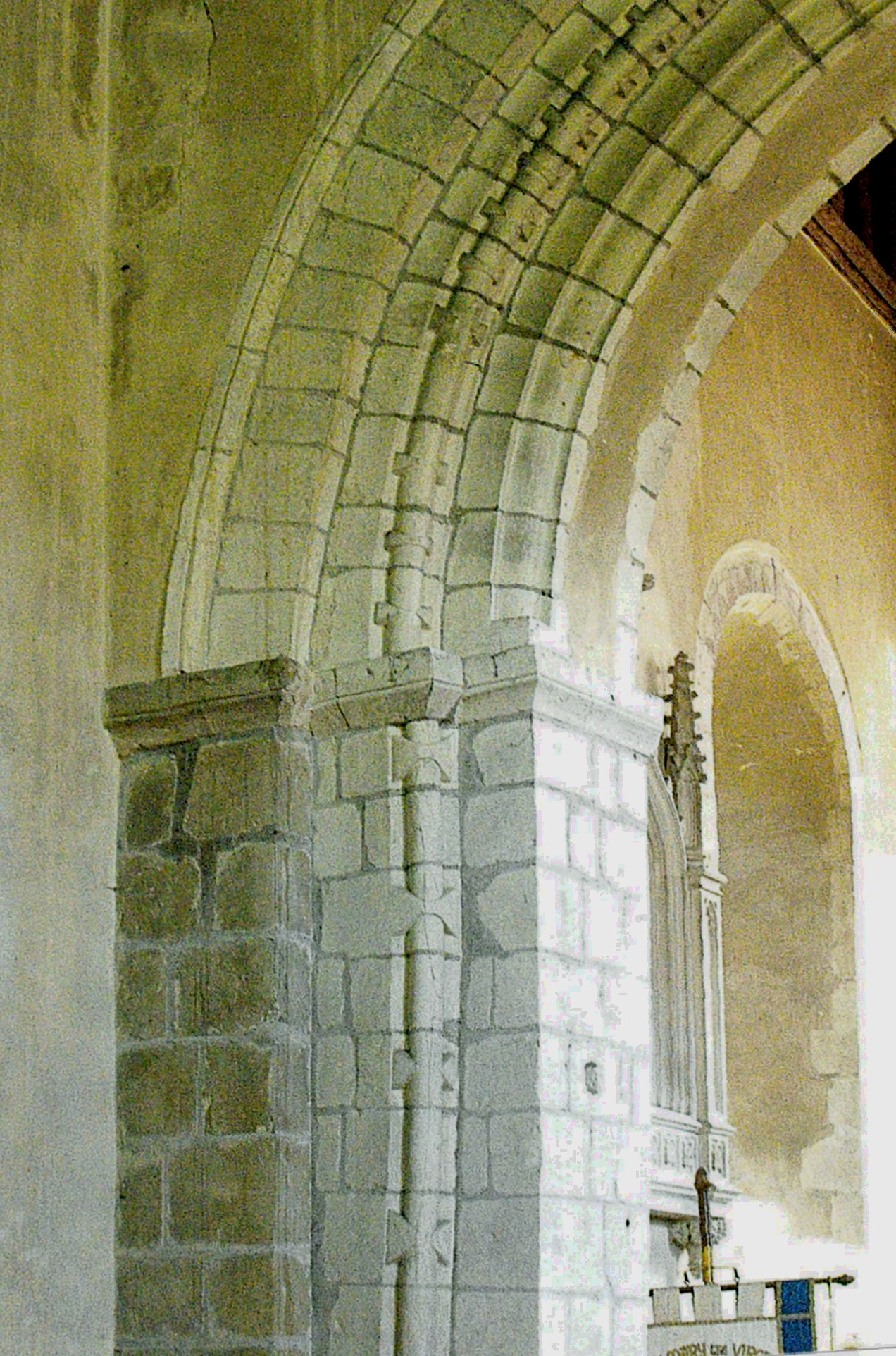 This is a fine Norman axial church (i.e. a church with a central tower but no transepts), built of roughly coursed stone and roofed with Horsham slates from the Weald Clay division of the Lower Cretaceous Series. The chancel is short, the tower rises in two stages with the bell-stage recessed, and the present N. aisle and cross-gabled vestry are additions of 1893 to the designs of John Loughborough Pearson (1817-97). The early twelfth century building parts of the building are distinguished by their double-splayed windows (i.e. splayed inside and out), the way in which the S. walls of the nave and tower have been built as a continuous stretch of masonry, and - most especially, perhaps - by the massive arches between the nave and tower, and the tower and chancel. (The tower is now fitted out internally as the western half of a single, longer chancel, but this is unlikely to have been the original arrangement.) The double-splayed window is usually associated with Saxon work or work from the so-called 'Anglo-Norman overlap', and the twelfth century is a late date to encounter this form. That is by no means the only odd feature here, however, for the tower arch mouldings are almost entirely non-standard, suggesting the mason responsible was a local man, unaware of developments in other parts of the country. These arches must now be described in some detail, beginning with the W. arch leading from the nave to the tower (illustrated below left).