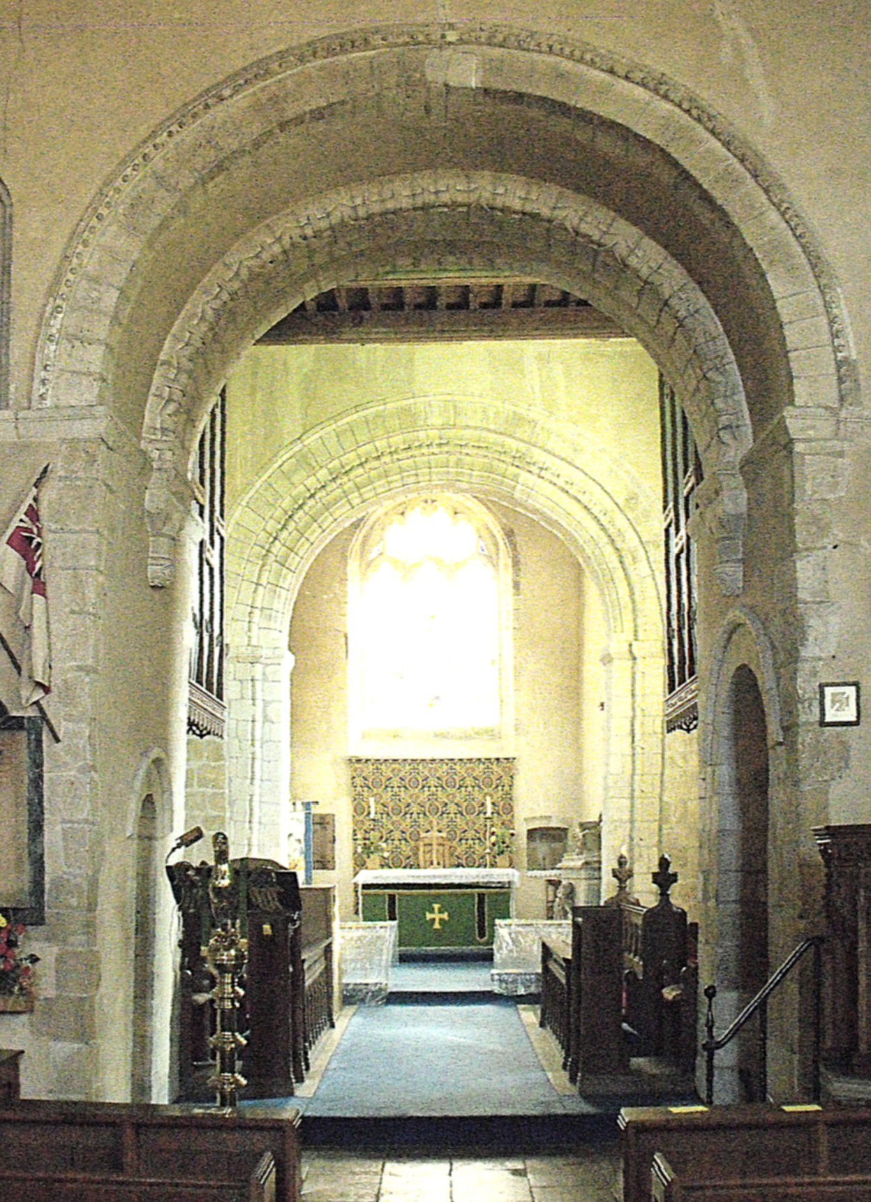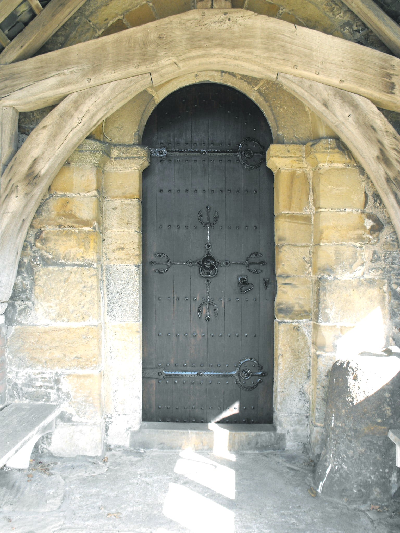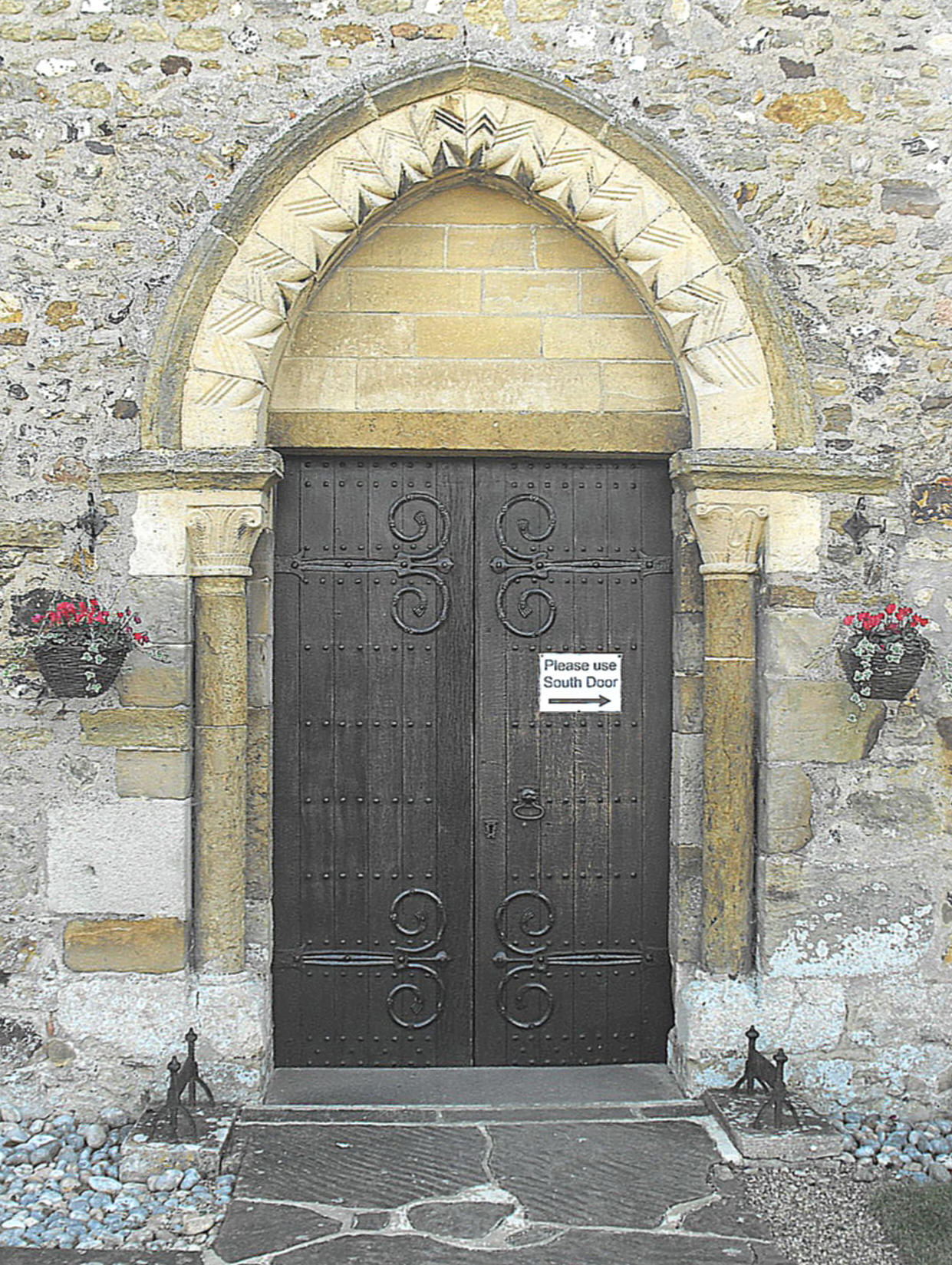 The original doorway into the church was presumably from the south, and this can still be seen, inside the half-timbered (fifteenth century?) porch with a cambered tie-beam roof. Composed of two orders, this is both narrow and plain (as shown below), with only the hollowed under-edges of the imposts to distinguish it.