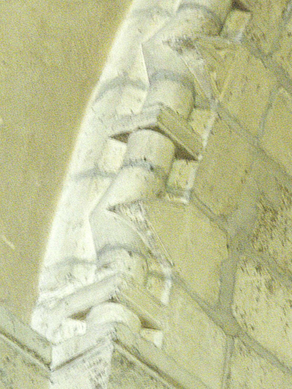 This is approximately eight feet (2.4 m.) deep and composed of two orders, of which the inner order is formed of a much narrower section beneath the soffit, supported on figure corbels. It carries a roll divided into sections by intervening squares, with each section bent into a zigzag in the middle (as shown in the detailed photograph above right). The outer order is unmoulded except for a repeating ornament on the hood-mould, which resembles a row of rivets. The arch reveals are cut by doorways left and right, the former providing access to the large square stair turret to the north and the latter, opening externally.