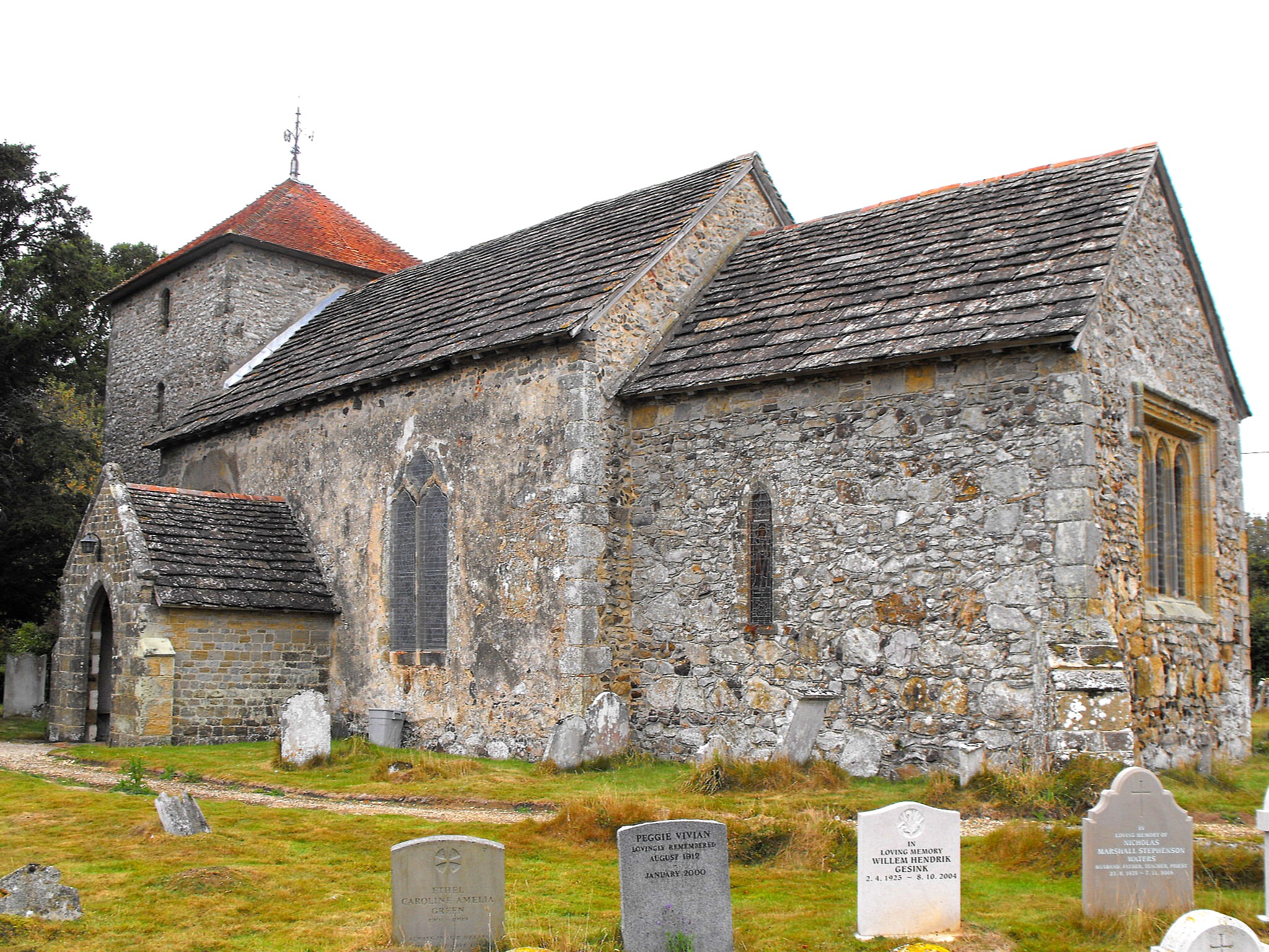 This is a solidly-constructed little Wealden church (shown above, from the southeast), built of grey stone rubble and roofed with Horsham slates from the Weald Clay Division of the Lower Cretaceous Series, and of rather greater significance than its uncommunicative exterior suggests. Consisting of a W. tower, nave and chancel, with the addition of a S. porch and N. vestry, it is lit - in chronological order - by one lancet window on each side of the chancel (i.e. north and south), a two-light Decorated window with trefoil-cusped ogee lights and a quatrefoil above, on each side of the nave towards the east, and a three-light cinquefoil-cusped square-headed window in the chancel E. wall (illustrated below left), which can probably be dated c. 1220, c. 1320, and c. 1480 respectively. The tower is broad and squat, and rises, undivided by string courses, to a tiled pyramidal roof, supported by diagonal buttresses for the first twelve feet only (approximately 4 m.). The bell-openings consist merely of a small arched opening on each side, and there is a similar opening a little below to the west and south. The main W. window is formed of two adjoining, equal, uncusped round-arched lights, above the four-centred blocked doorway, suggesting the tower was built or rebuilt in the seventeenth century. Thus it is something of a shock, on entering the porch, to be confronted by the early Norman inner doorway (as seen below right), but this not only serves to date the church’s basic structure, but also prepares the visitor for the much greater moment of the building’s interior.